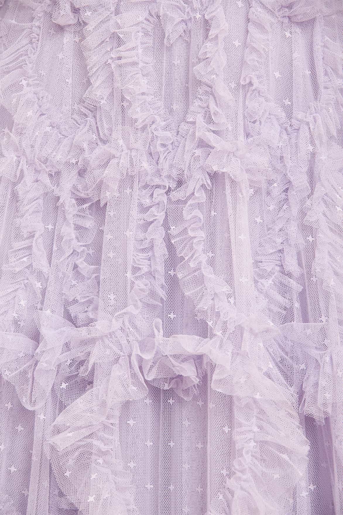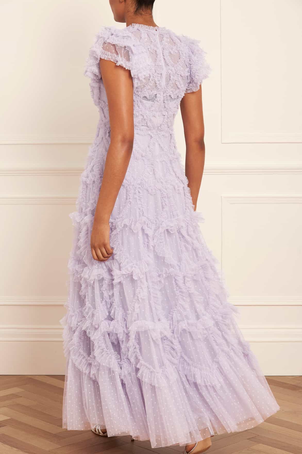 The Amorette V-Neck Gown in Dusk Lilac. A signature Needle & Thread style; beautifully adorned with our key love heart motif, made from gently gathered delicate tulle. Designed with romantic, frothy sleeves created using layers of delicate tulle and frills for a statement look. Featuring a generously voluminous skirt layered with tulle and net for a full, magical silhouette. A textile piece you'll forever treasure.