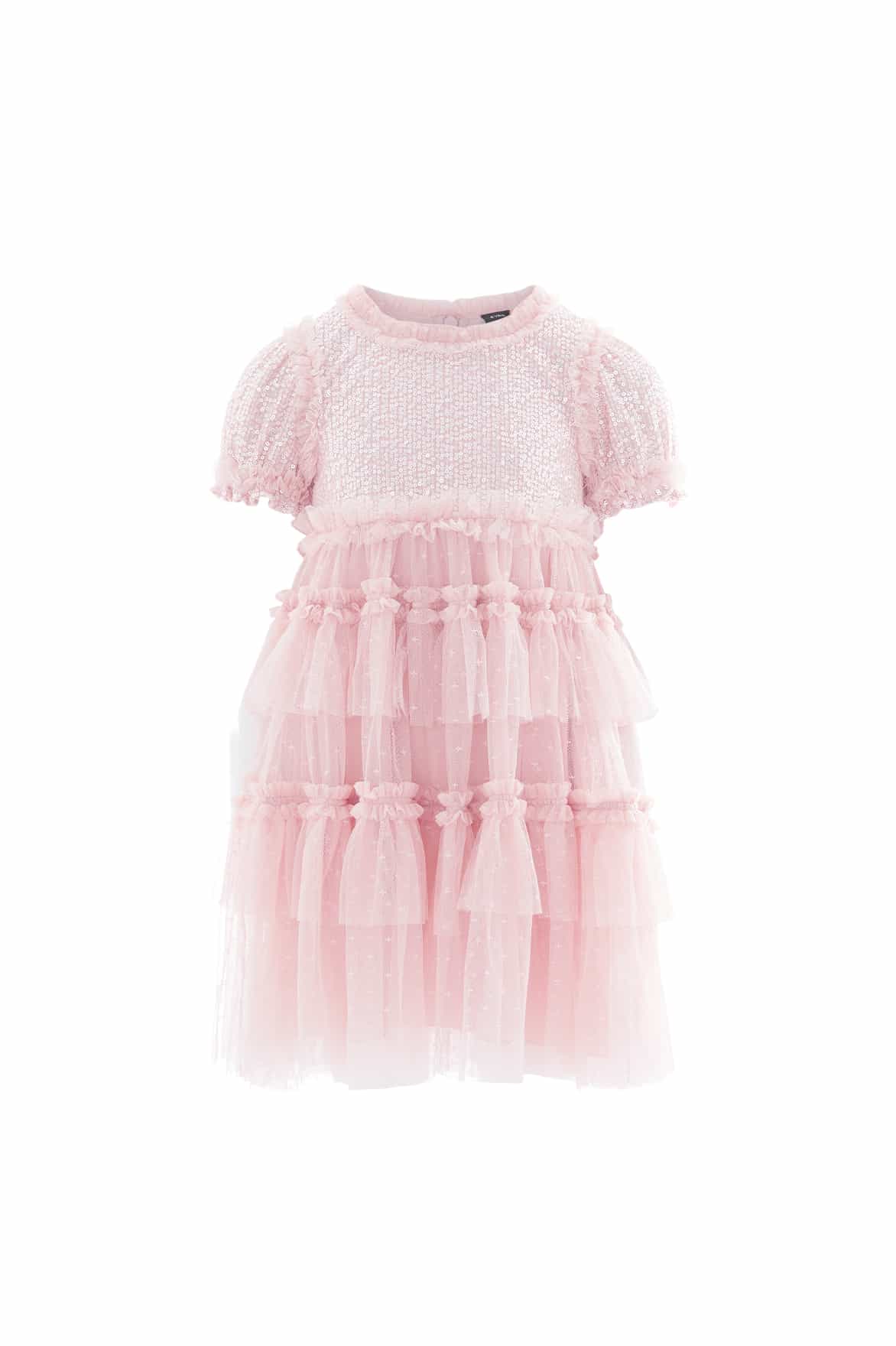 The Annalise KIDS Dress in Dusk Pink. This enchanting dress features a shimmering bodice and puff sleeves adorned with sequins for a glittering finish. Signature Needle & Thread tulle frills trim the neckline, cuffs, shoulders, and waist for a romantic touch. The playful tiered skirt, crafted from soft net and tulle with frothy topstitched ruffles, flows into a sweeping hem—perfect for twirling. A whimsical statement dress for sparkling moments.