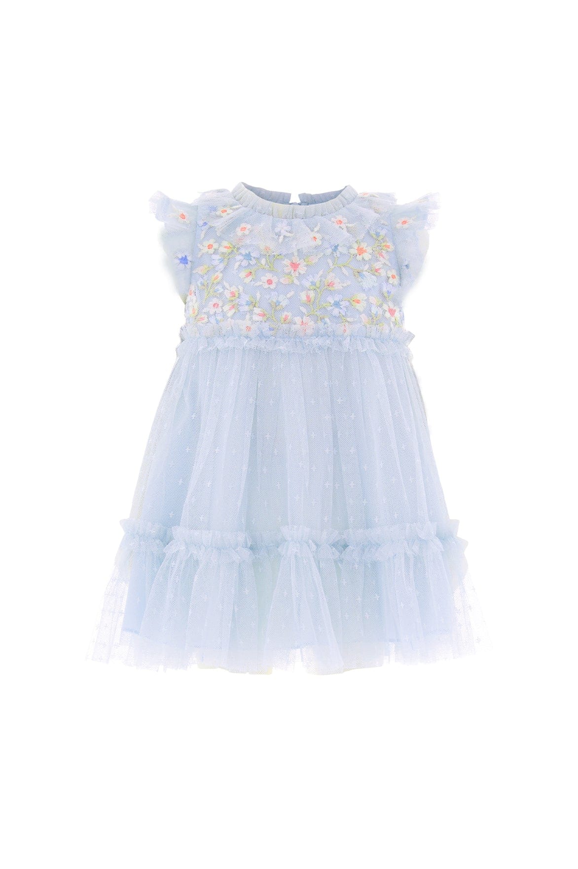 The Antoinettes Floral Bodice Baby Dress in Dusk Blue. A dreamy piece inspired by the romance of Versailles. Crafted with delicate multicoloured floral embroidery scattered across a cloud of tulle, signature frills at the neckline and waist add a touch of enchantment. Designed with layered tulle sleeves and a gently ruffled skirt, it creates a floaty, ethereal silhouette. Finished with a breathable cotton voile lining and frilled bloomers for comfort. This dress is perfect for every magical moment.