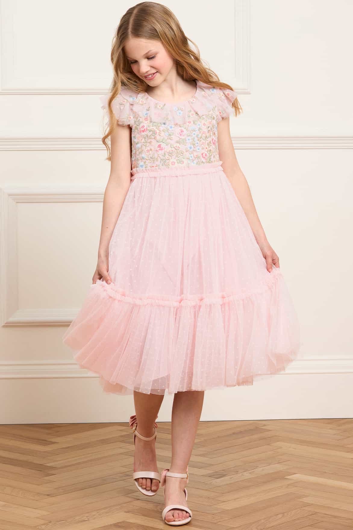 The Antoinettes Floral Bodice KIDS Dress in Dusk Pink. This enchanting dress features a beautifully embroidered bodice with multicoloured floral bouquets, inspired by the lavish interiors of Versailles. Tulle frill neckline and sleeves are dotted with ditsy floral motifs, while the softly gathered skirt tier adds volume for a twirl-worthy finish. The perfect dress for a special occasion, a charming flower girl moment, or simply for dressing up.