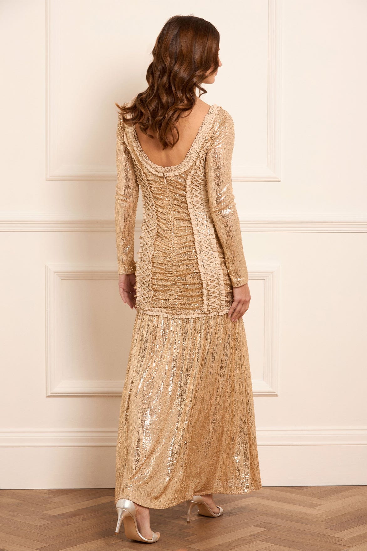 The Arabella Long Sleeve Gown in Parchment/Metallic. This statement piece has a slim, flattering silhouette. It is crafted from a stretch mesh base and features intricate sequin detailing that creates a captivating shimmer. The body is softly ruched, with a drop hem tier adorned with satin frills. Designed with satin lace-up detailing, threaded through silver eyelets, accentuates the gown's contour. Developed with long, slim sleeves gently gathered and embellished with sequins for added elegance. The epitome of luxury and glamour.