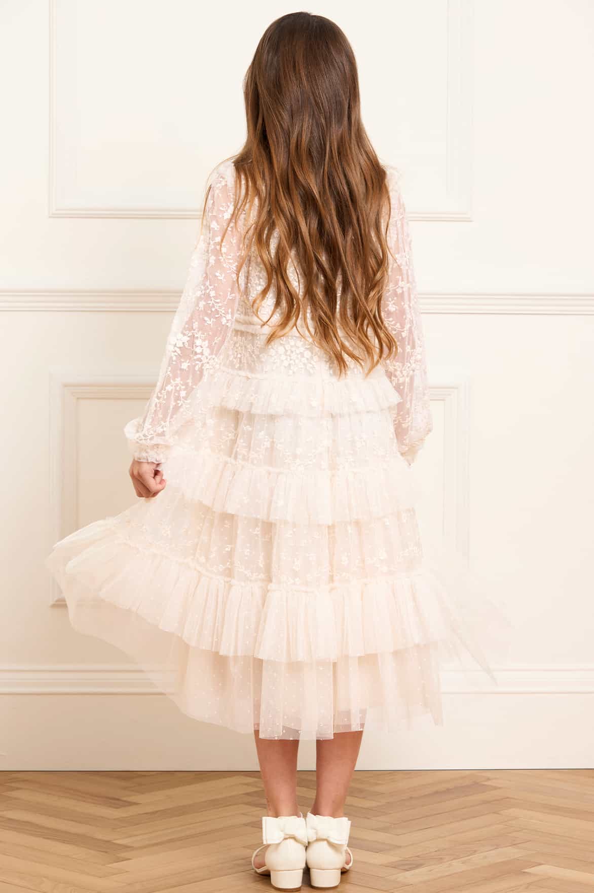 The Blossom Lace Kids Dress in Cream. This enchanting dress features intricate embroidery inspired by vintage lace, capturing timeless elegance with a delicate touch. The blouson sleeves with ruffle cuffs add soft volume, while gently gathered skirt tiers adorned with frills create beautiful movement. Finished with signature Needle & Thread frills at the neckline, shoulders, and waist, this piece is full of romantic, heirloom charm.