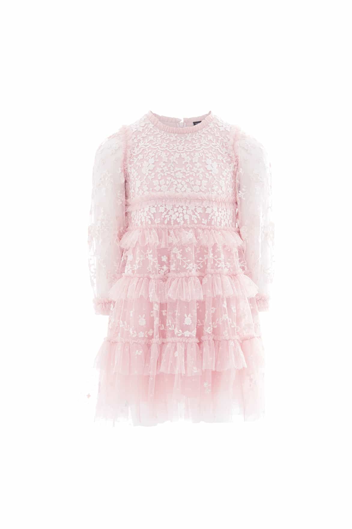 The Blossom Lace Kids Dress in Dusk Pink/Cream. This enchanting dress features intricate embroidery inspired by vintage lace, capturing timeless elegance with a delicate touch. The blouson sleeves with ruffle cuffs add soft volume, while gently gathered skirt tiers adorned with frills create beautiful movement. Finished with signature Needle & Thread frills at the neckline, shoulders, and waist, this piece is full of romantic, heirloom charm.
