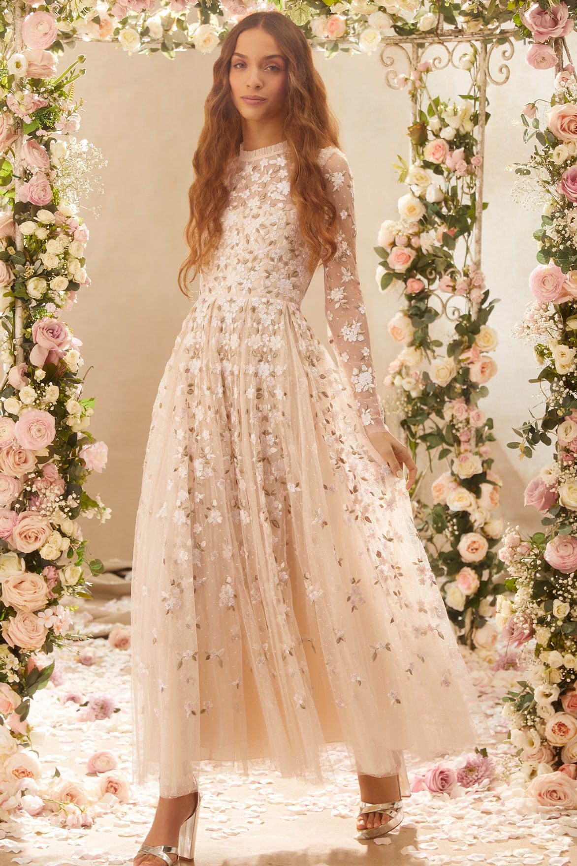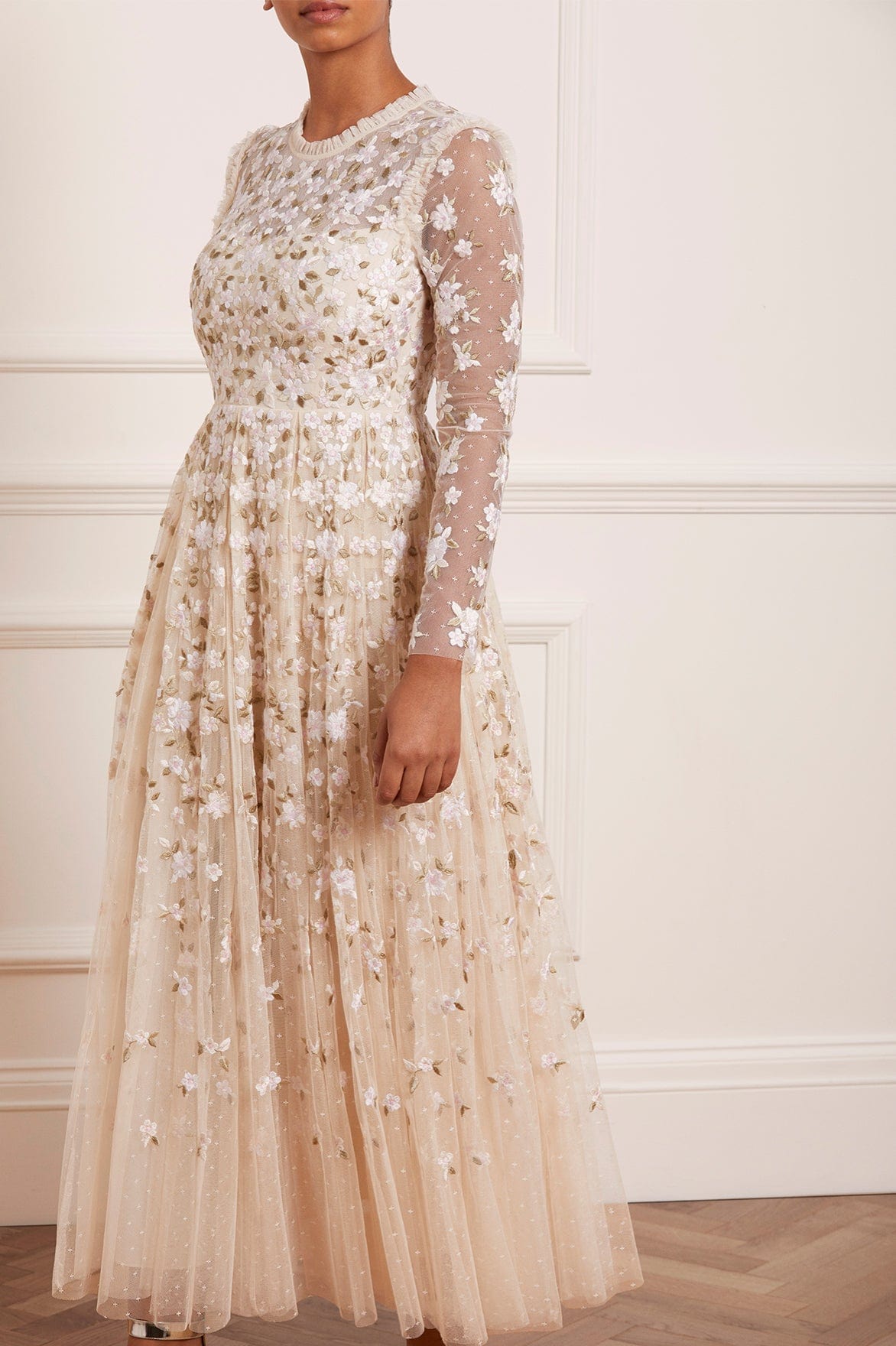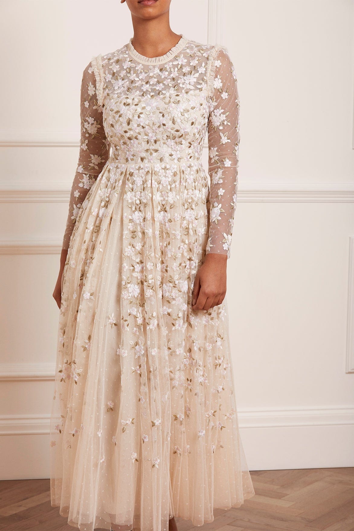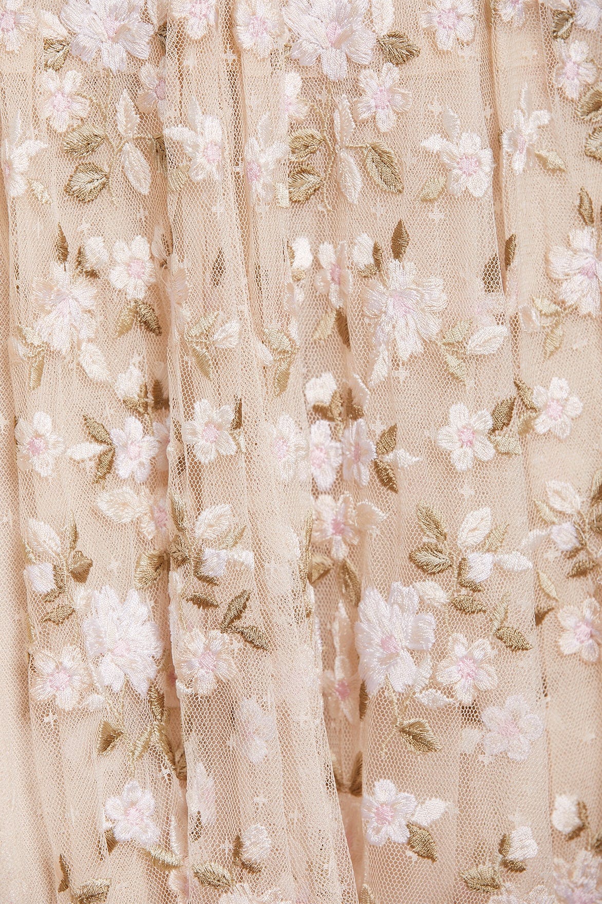 The Camellia Ditsy Ankle Gown in Champagne / White. A beautifully classic Needle & Thread style. The artwork of this dress is embroidered with floral motifs on soft, pretty tulle. This dress features a full pleated skirt, creating a voluminous shape for added movement. Be the first to make a statement in the Camellia.