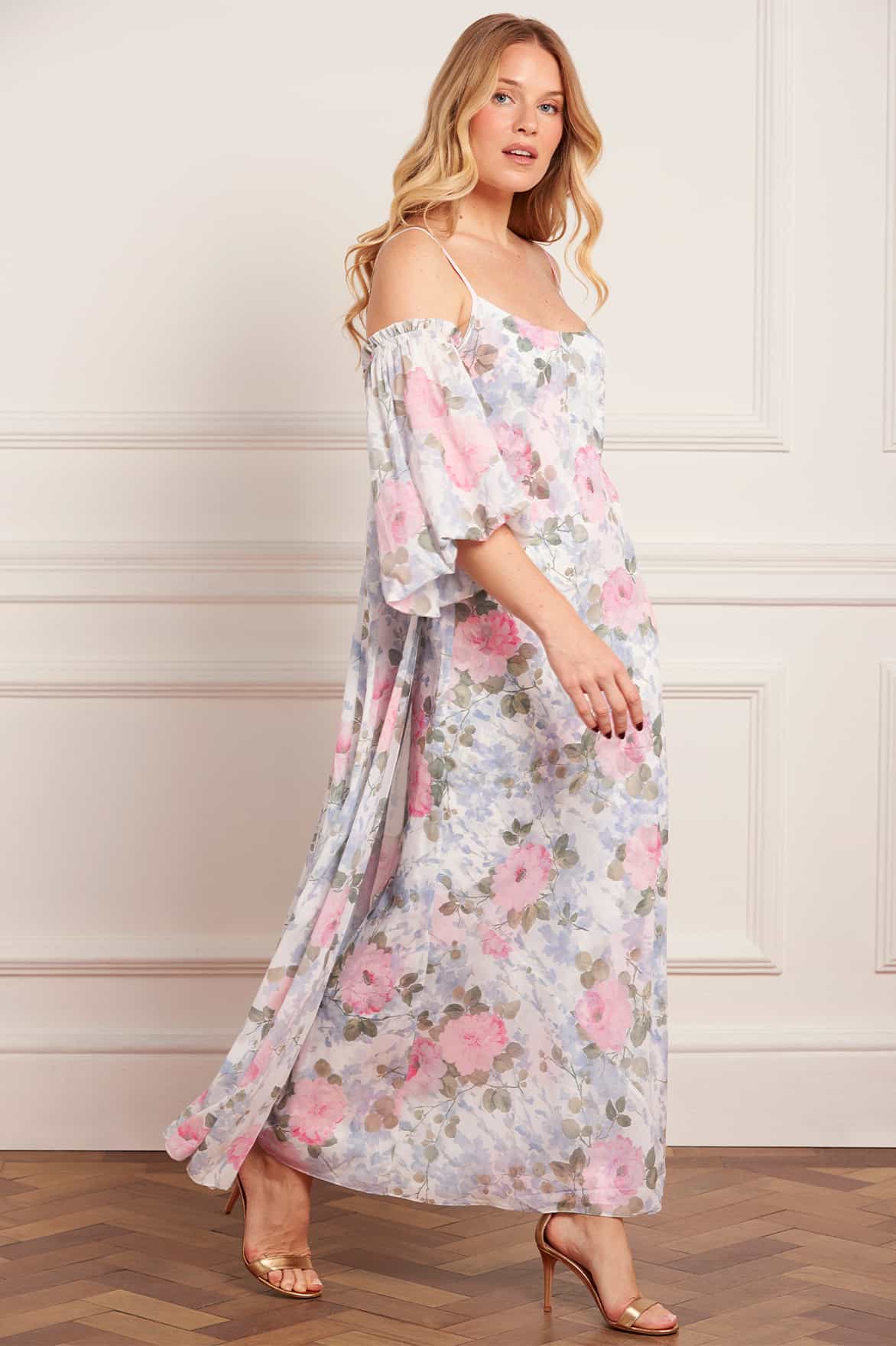 NEW SEASON | NEEDLE & THREAD EXCLUSIVE. The Camille’s Garden Azeline Chiffon Off-Shoulder Cape in Moonshine. Features a delicate floral print inspired by hand-painted artwork from the early 1900s. Designed with an elegant off-shoulder neckline and flowing chiffon cape, this exclusive style exudes effortless romance.