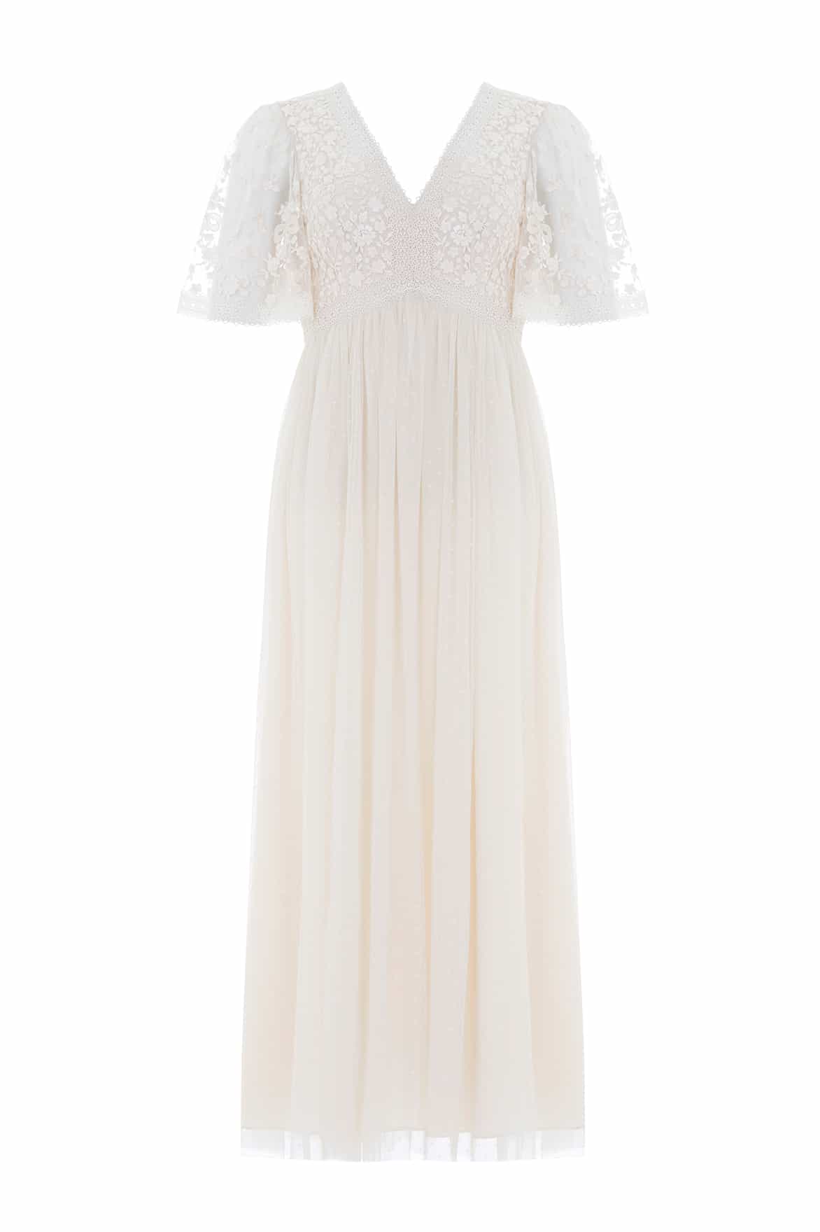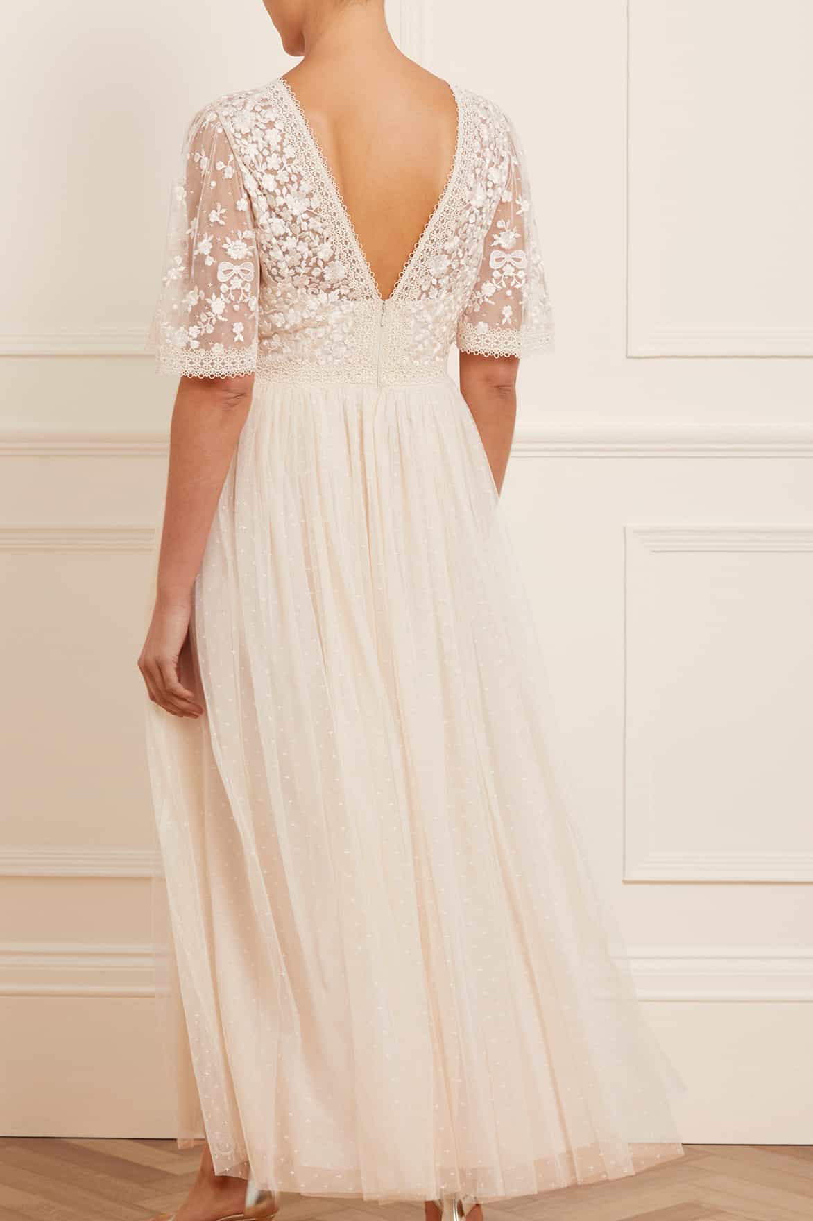 The Celestia Ribbon Bodice Ankle Gown in Cream. The bodice of this gown has been intricately designed with embroidery inspired by vintage lace, featuring delicate floral motifs and ribbon bows. Crafted with pretty lace trims for signature Needle & Thread detailing, and delicately constructed with a textured tulle fabric skirt. A Needle & Thread contemporary piece.
