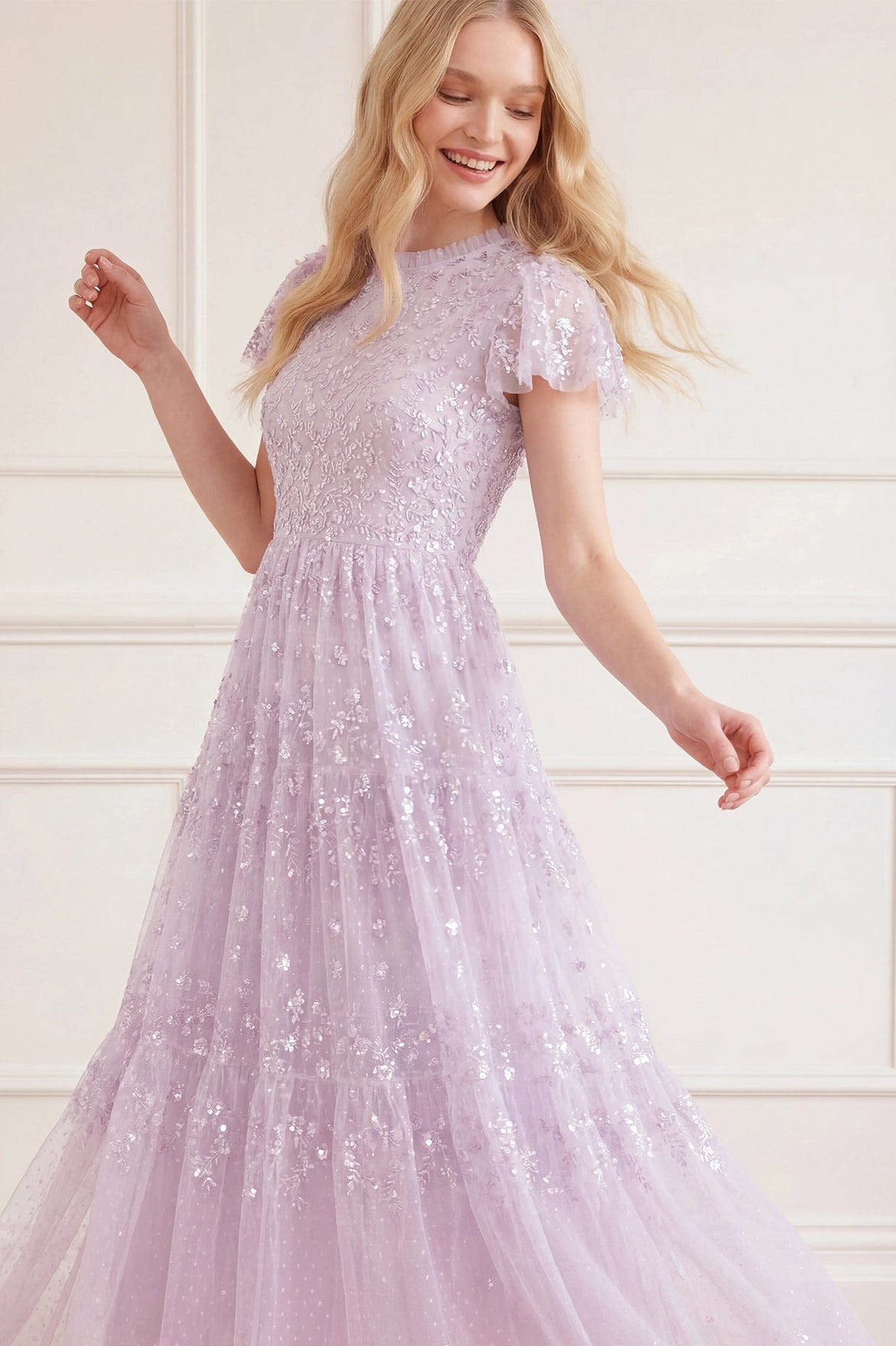 NEW SEASON. The Clover Short Sleeve Ankle Gown in Powder Lilac. This elegant gown features a refined short sleeve silhouette inspired by painted English gardens. Finished with a fluid ankle-length skirt, it creates a timeless and feminine shape for special occasions.