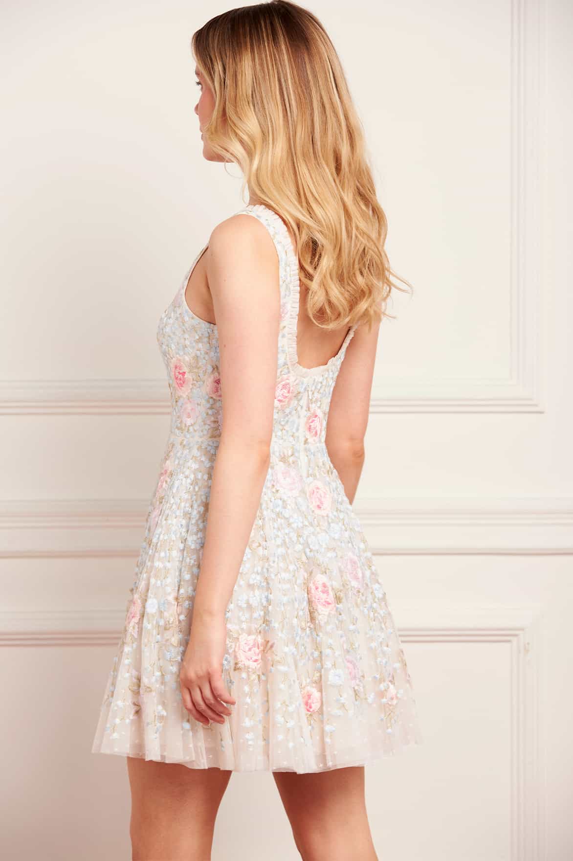 NEW SEASON. The Cressida Embroidery Scoop Neck Micro Mini Dress in Cream/Multi. Beautifully adorned with delicate floral motifs. Designed with a scoop neckline and layers of soft tulle, this playful silhouette brings a modern twist to classic Needle & Thread artistry.