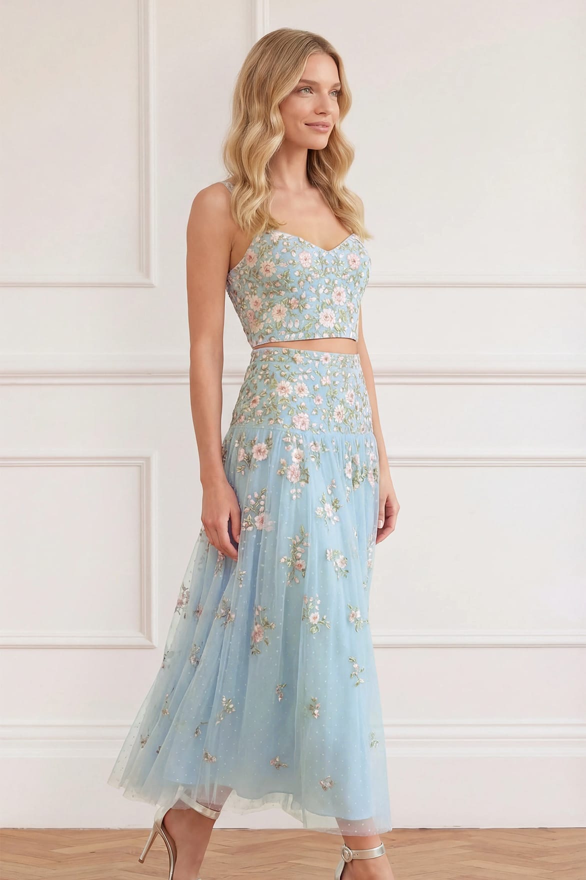 NEW SEASON. The Eden Rose Ankle Skirt in Aqua/Multi. This elegant ankle skirt features cascading Eden Rose embroidery that disperses into delicate ditsy florals towards the hem. Designed with a fluid silhouette for effortless movement, it is the perfect pairing with our coordinating Eden Rose top for summer occasion wear.