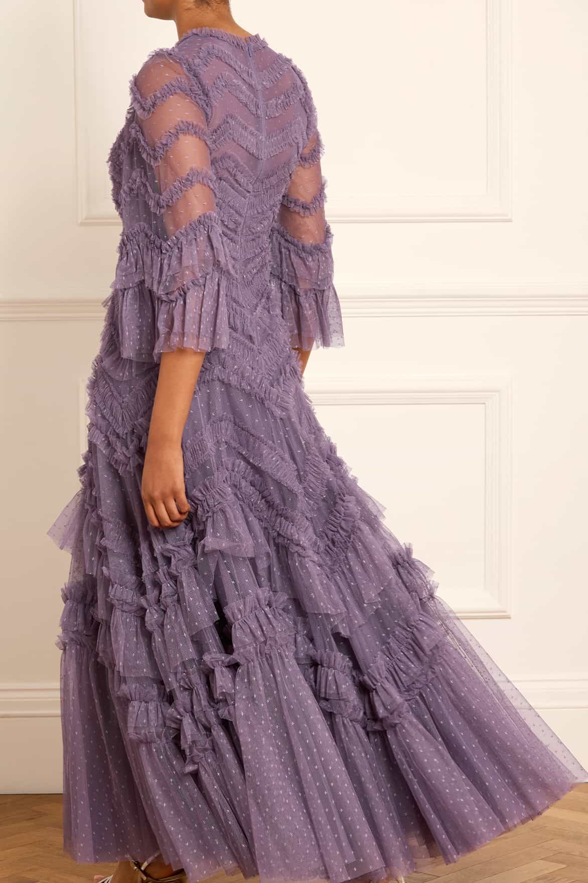 The Elia Long Sleeve Gown in Amethyst. This textile gown is beautifully designed with soft, delicate tulle ruffles that gradually increase in size towards the hem. Crafted with romantic, frothy fluted sleeves and developed using layers of soft tulle trimmed with frills, adding to this statement look. The skirt is made up of generous layers of net and tulle with a sweeping hemline. Expect all eyes on you in this statement style.