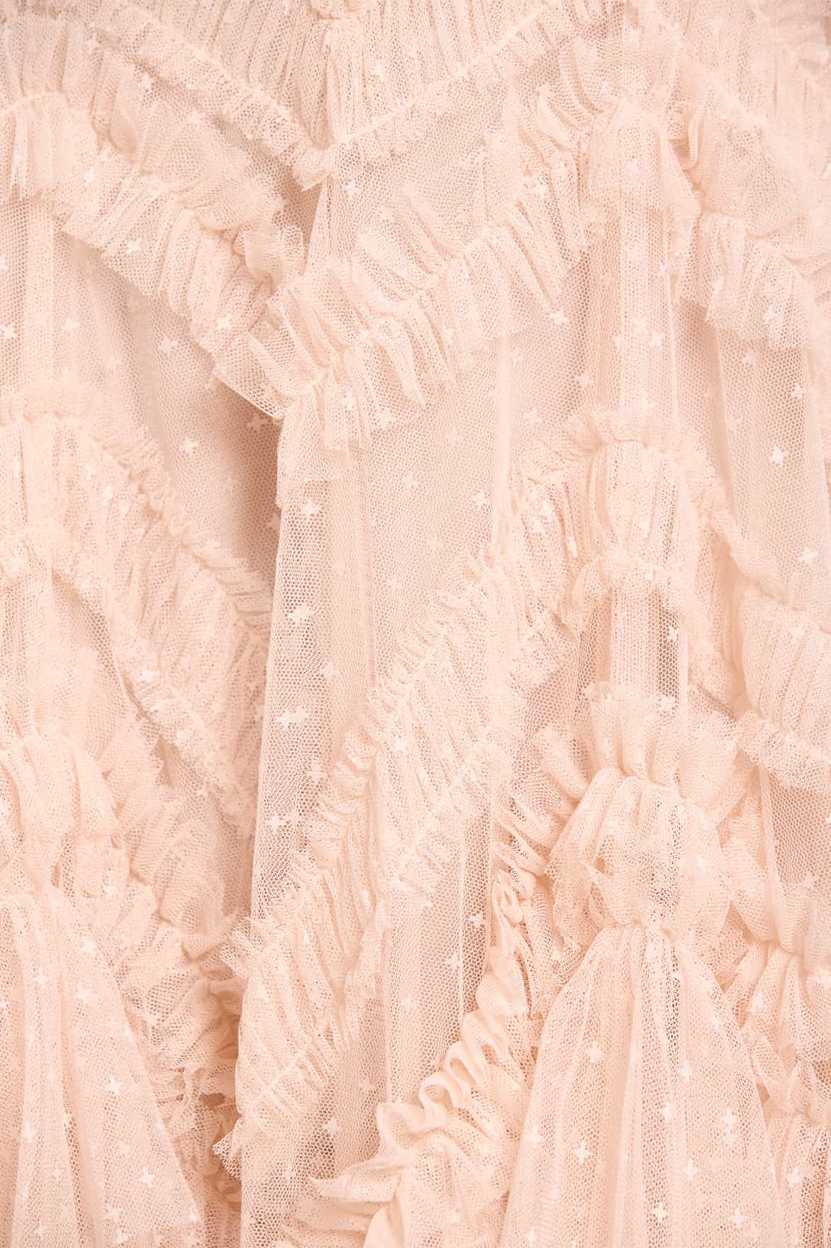 The Elia Long Sleeve Gown in Dust Beige. This textile gown is beautifully designed with soft, delicate tulle ruffles that gradually increase in size towards the hem. Crafted with romantic, frothy fluted sleeves and developed using layers of soft tulle trimmed with frills, adding to this statement look. The skirt is made up of generous layers of net and tulle with a sweeping hemline. Expect all eyes on you in this statement style.