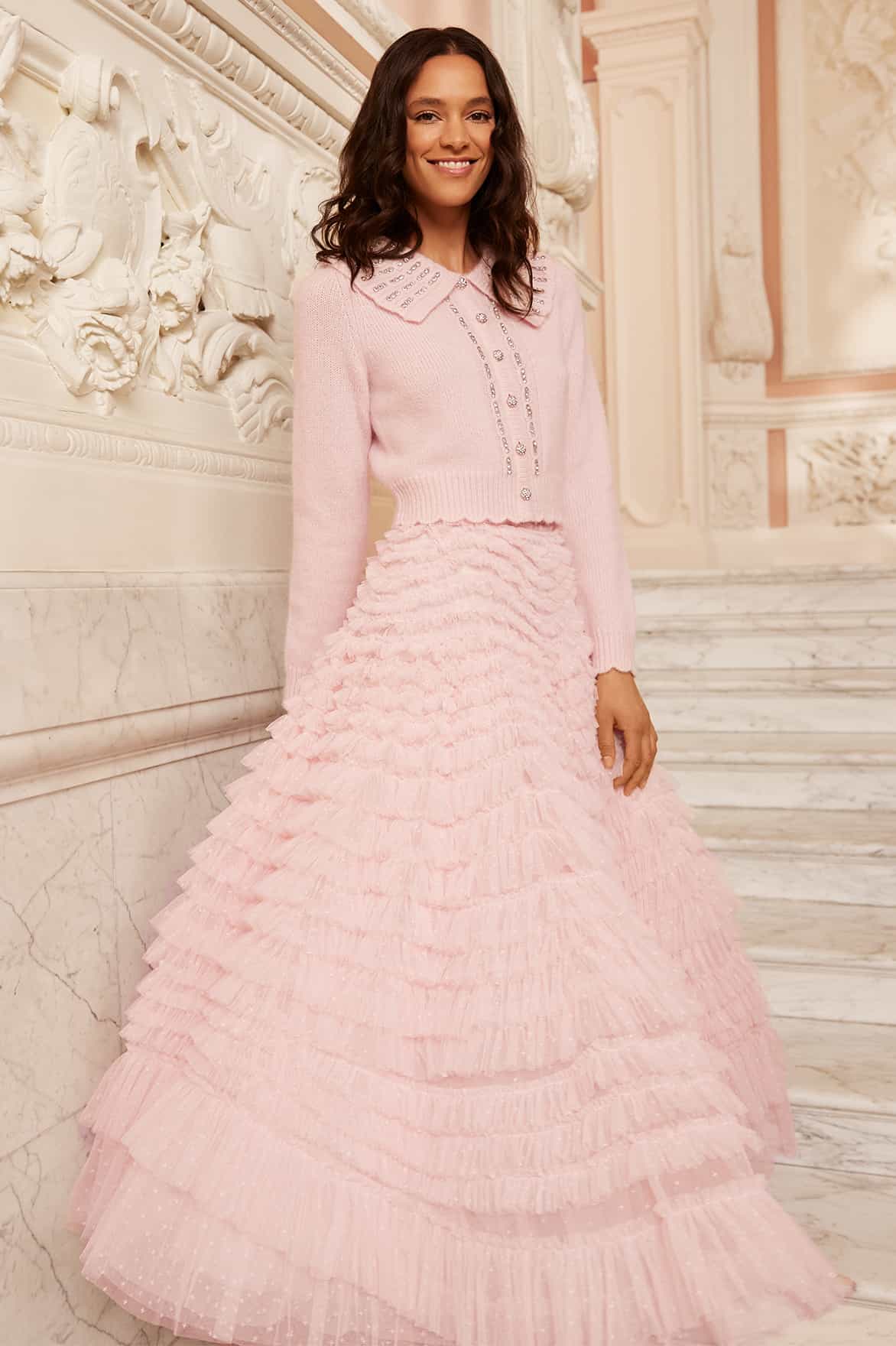 The Embellished Collar Short Cardigan in Peony Pink. This embellished cardigan is developed from alpaca yarn, creating a soft, fluffy texture. Designed with a short silhouette, slim fit sleeves and signature Needle & Thread scallop detailing on the cuff and hem. This pretty style is beautifully crafted with diamante jewel buttons, a bib-neck collar and framed with crystal gems for a feminine look. This elegant style is a new season favourite.