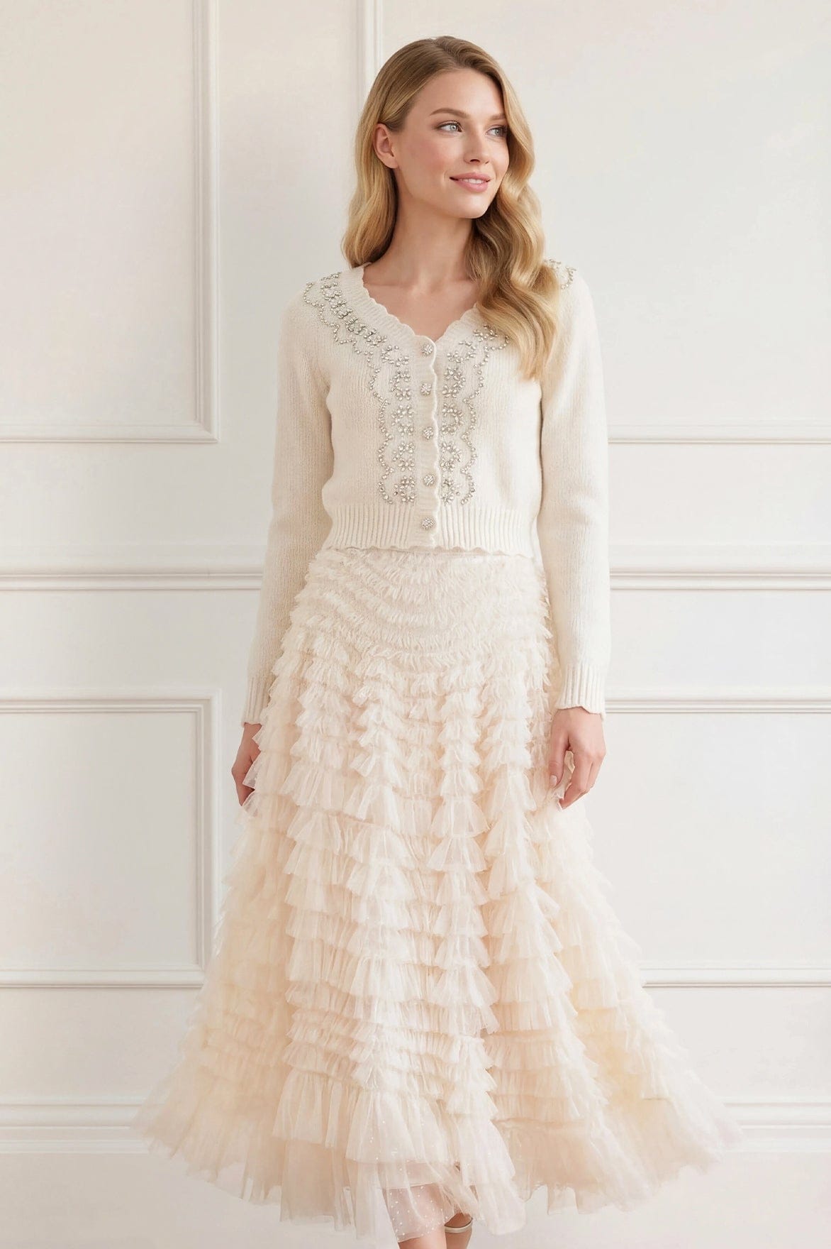 NEW SEASON | NEEDLE & THREAD EXCLUSIVE. The Embellished V-Neck Short Cardigan in Cream. Thoughtfully crafted with intricate embellishment, this piece exudes understated elegance. Designed with a flattering V-neck and a softly contoured fit, it adds subtle texture and a graceful shimmer to your look.
