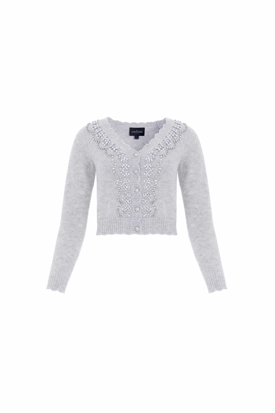 The Embellished V-Neck Short Cardigan in Pale Grey. This cardigan features a glittering embellishment inspired by delicate vintage lace. The neckline is adorned with crystal gems for romantic styling. Developed in soft merino wool blended with cashmere for a feminine texture, this cardigan has a short silhouette with slim-fit sleeves and body. Designed with a V-neck, scallop detailing, and jewel buttons for a signature Needle & Thread look.