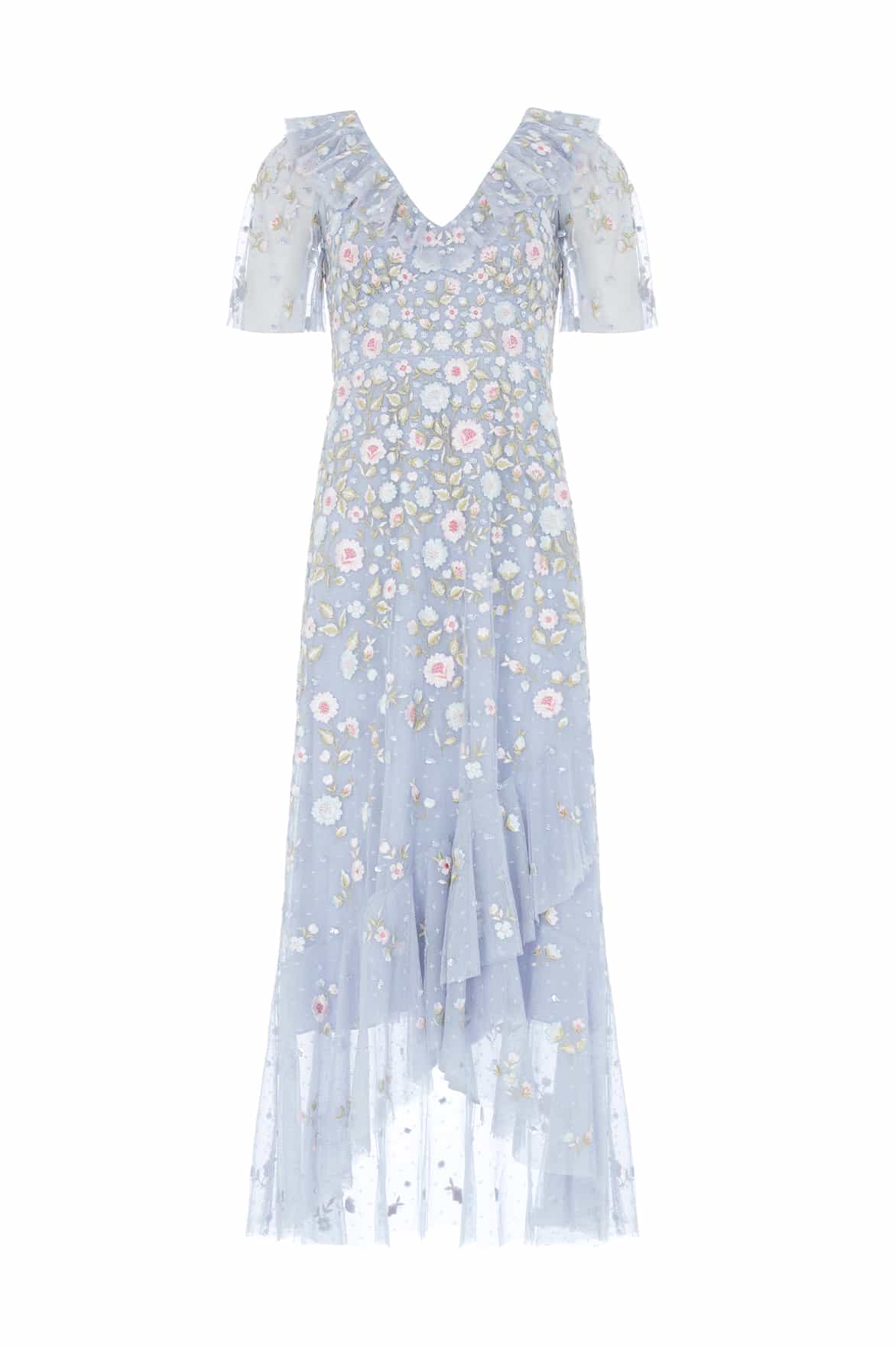 NEW SEASON. The Ethereal Blooms Frill Ankle Gown in Skylight/Multi. A romantic tulle design featuring exquisite floral embroidery interspersed with subtle sequin motifs. Finished with delicate frill detailing and soft pastel tones, this gown exudes lightness and refined grace.