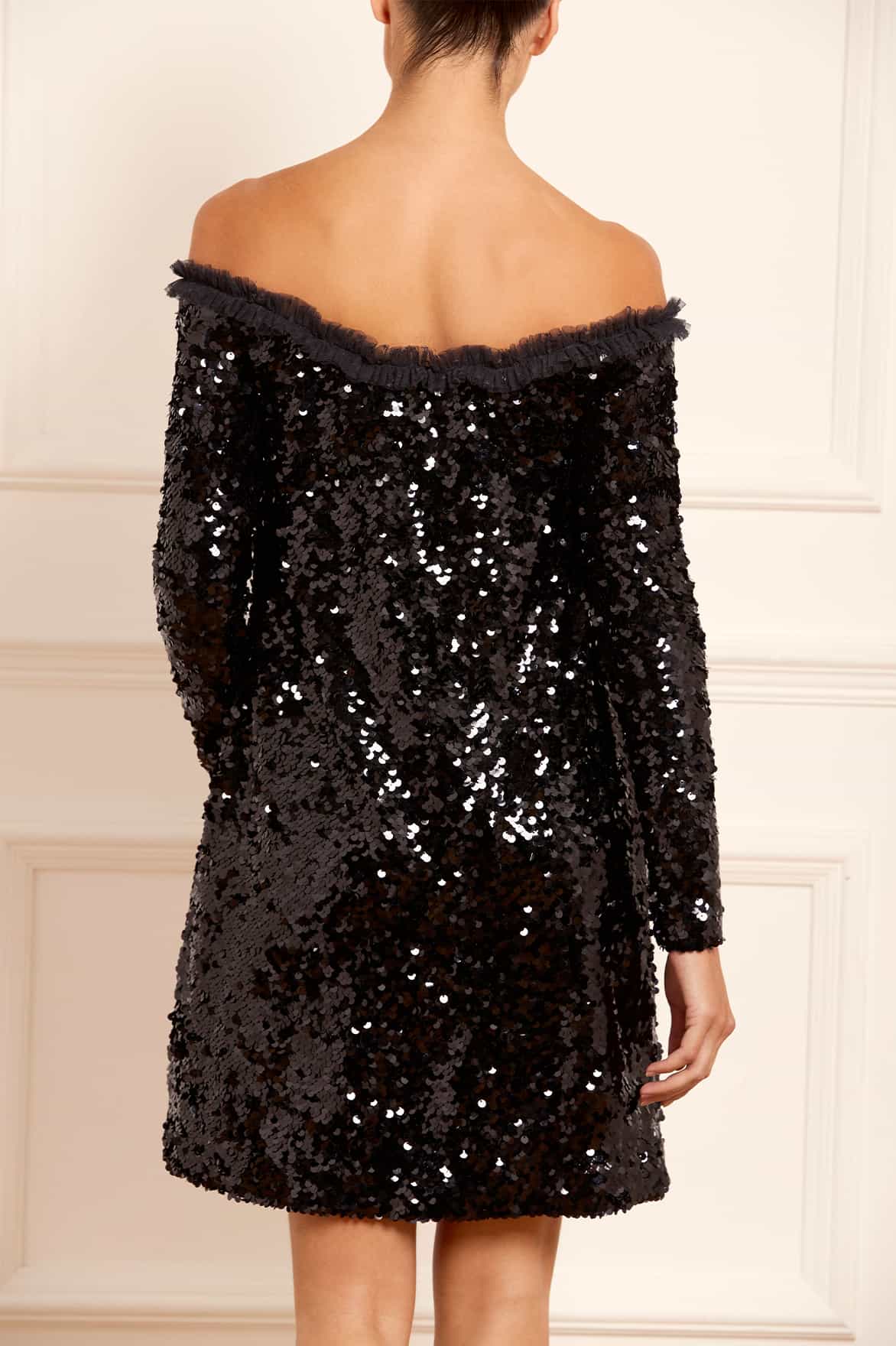 NEEDLE & THREAD EXCLUSIVE. The Evie Off-Shoulder Micro Mini Dress in Graphite. This statement dress is decorated with sparkling sequins. Designed with an elegant off-shoulder design adorned with signature Needle & Thread tulle frills and slim long sleeves. Crafted with a flattering loose-fit A-line silhouette. Developed with an all-over sequin fabric featuring side-hole sequins that overlap to create a decadent, luxe, shimmering look with a stretch base for comfort and style. The dress also includes a mesh bralette for ultimate comfort and an easy fit. The perfect party dress you'll wear time and time again.