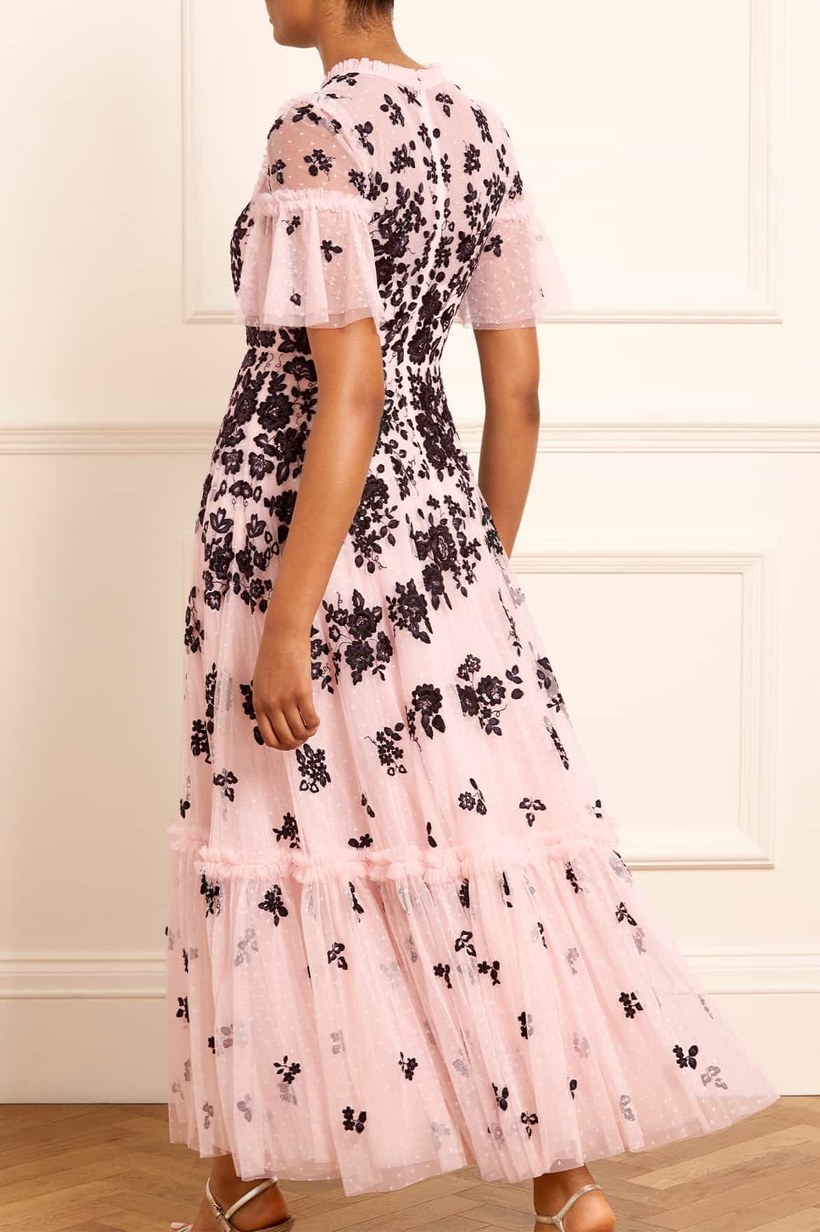 The Fluttering Flowers Ankle Gown in Dusk Pink/Black. This romantic floral artwork depicts clusters of trailing floral motifs embroidered in striking contrast thread and scattered with shimmering sequins. The gown features a layered sleeve with signature Needle & Thread tulle frills, adding a touch of elegance. The skirt is crafted from layers of soft tulle and net for a flattering fit, and the softly gathered romantic hem tier is trimmed with a ruffle, creating a beautiful and romantic statement style.