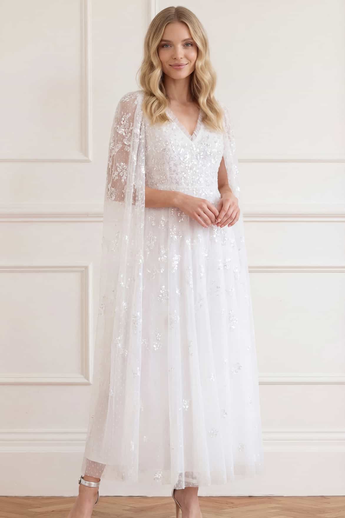 NEW SEASON. The Freesia Shimmer Cape Sleeve Ankle Gown in Swan White/Pink. This ethereal gown features subtle shimmering detailing across a softly sculpted silhouette. Designed with flowing cape sleeves and an ankle-length skirt, it moves effortlessly with every step. Ideal for elevated evening events and special celebrations.