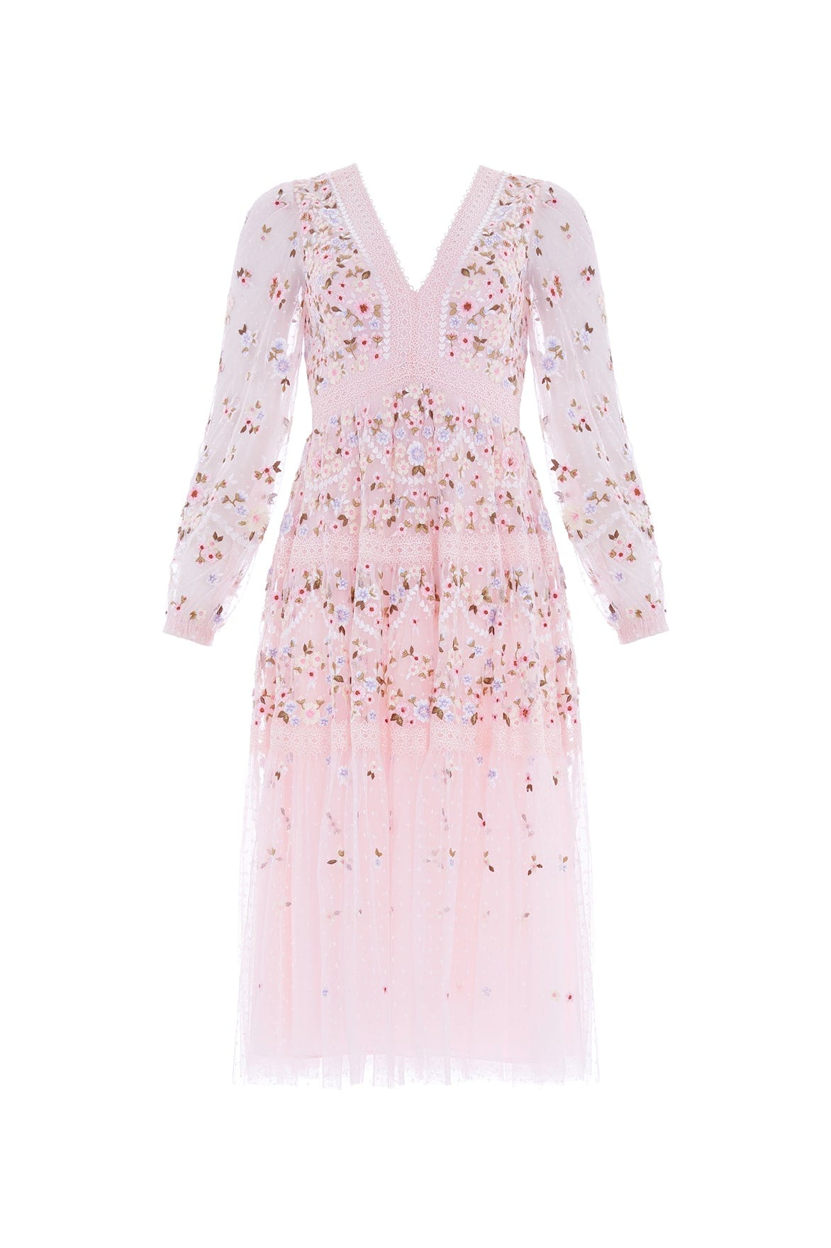 The Garland Ribbon Midaxi Dress in Peony Pink. This embroidered dress is inspired by Victorian lace trims. Beautifully designed with floral embroideries in soft pastel tones. Developed with a V-shaped waist seam to create a flattering, effortless fit. This dress is adorned with intricate lace trims for signature Needle & Thread detailing. A pretty piece you'll forever treasure.
