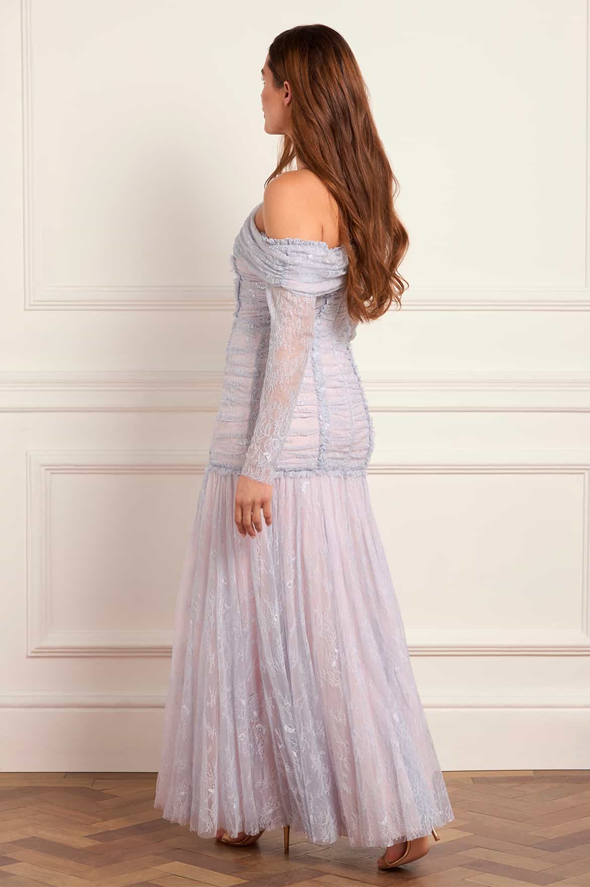 NEW SEASON. The Gigi Lace One-Shoulder Rouched Gown in Skylight/Seashell. A romantic statement crafted from delicate lace. Designed with a ruched bodice and one-shoulder silhouette, this gown combines soft texture and modern elegance in a refined pastel palette.