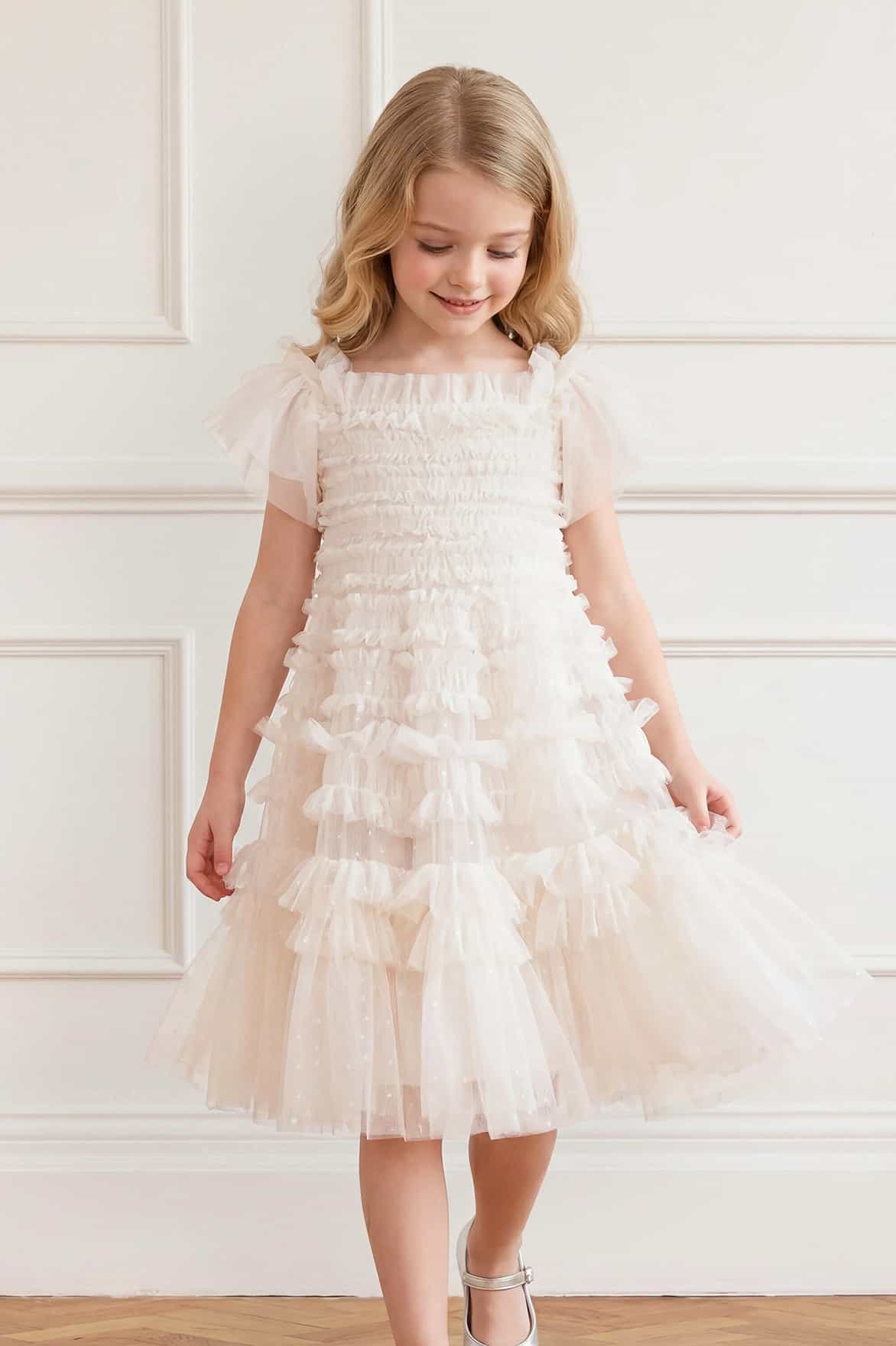 NEW SEASON. The Lisette Kids Dress in Swan White. Inspired by the romantic off-shoulder Lisette silhouette, this kids dress features soft ruffle detailing and a full, elegant skirt. The shape is designed for comfort while maintaining a special, elevated feel. A beautiful flower girl style, designed to sit alongside the Lisette Ruffle Off-Shoulder Gown.