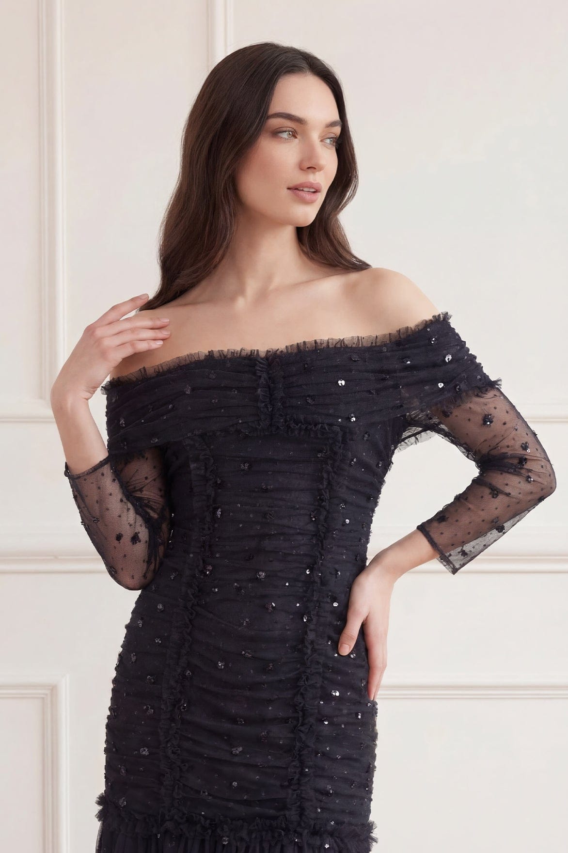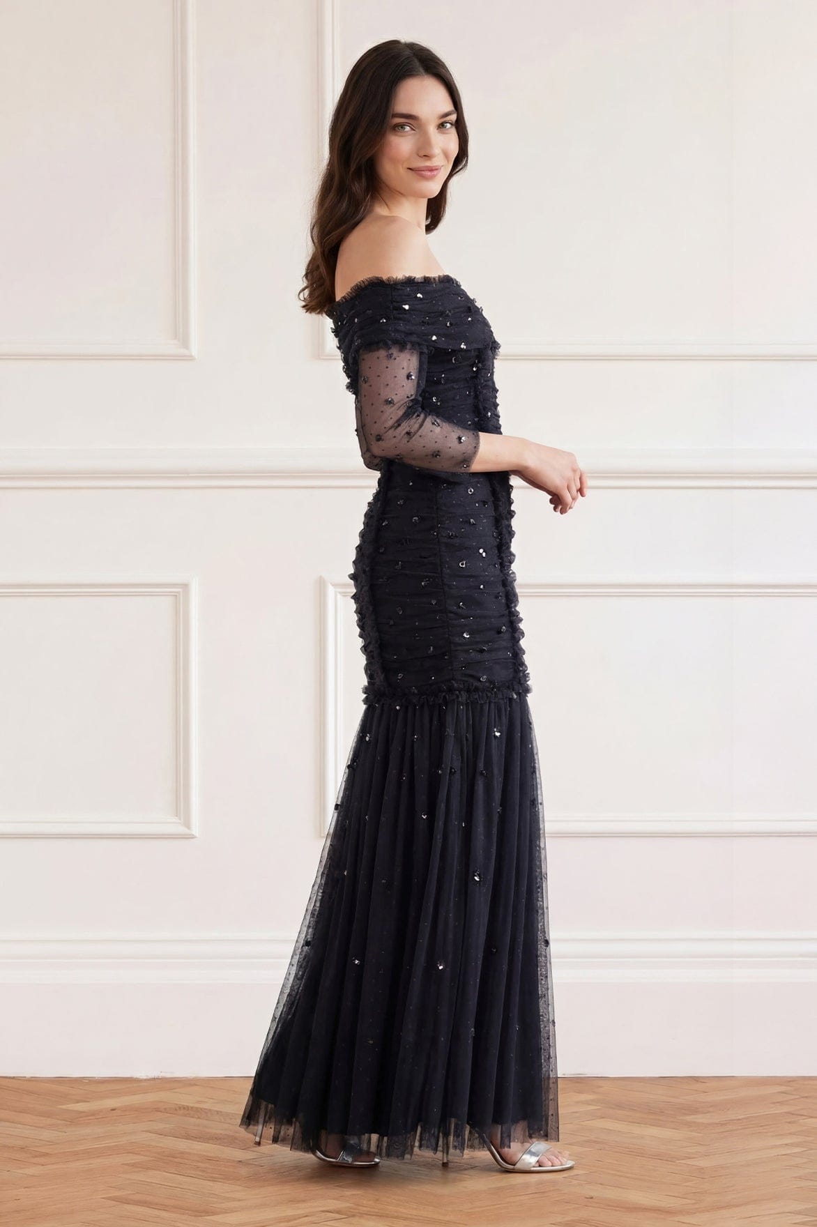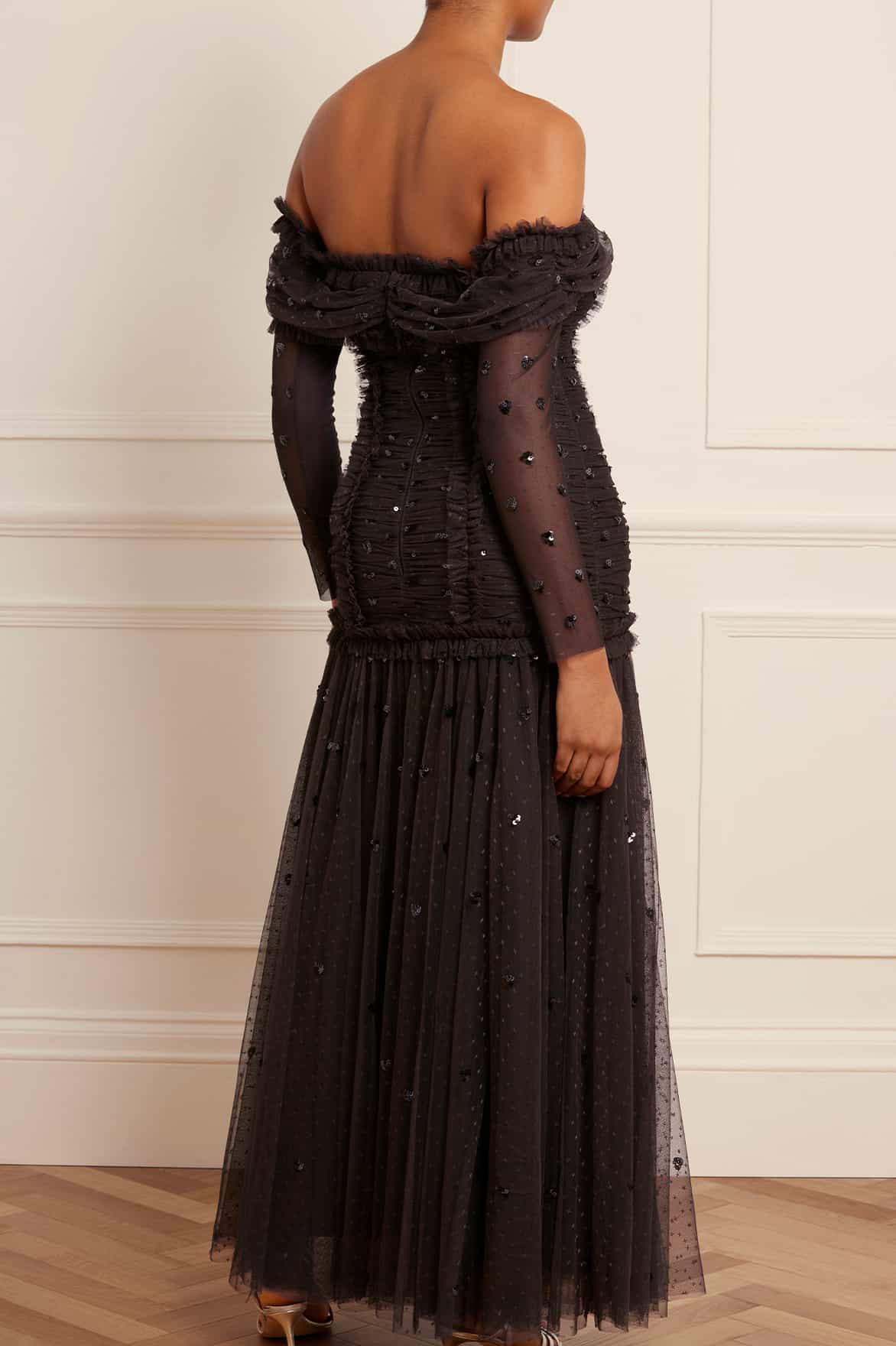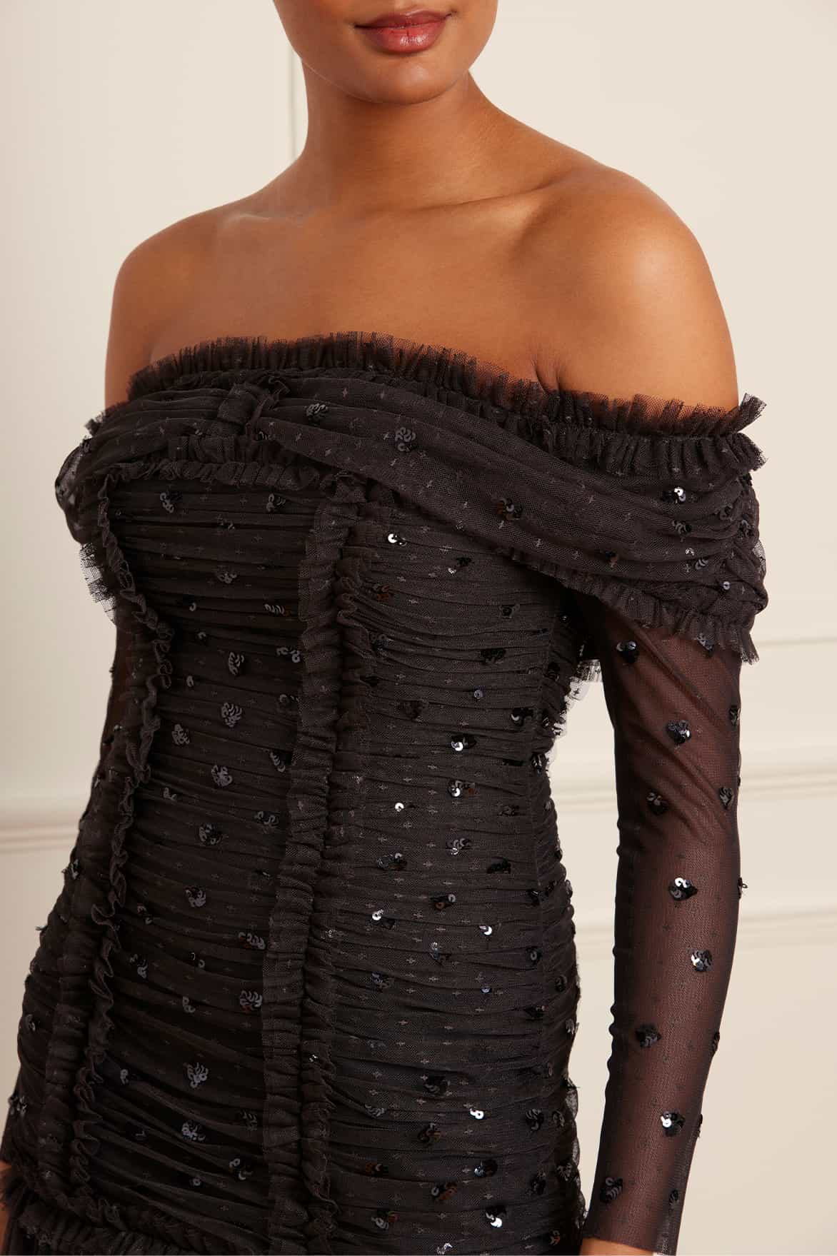 The Love Heart Rouched 0ff-Shoulder Gown in Graphite. This gown is decorated with sequins in love-heart motifs creating an all-over shimmering effect. Beautifully designed with a figure hugging silhouette featuring gentle ruching throughout the body to create a flattering effect. Developed in power mesh fabric for stretch and comfort. A season favourite at Needle & Thread HQ.
