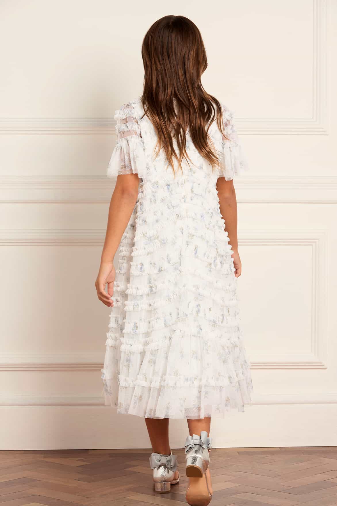 NEW SEASON. The Magnolia Ditsy Amara Ruffle Kids Dress in Moonshine/Skylight. Features whimsical ditsy florals scattered across airy tulle. With signature ruffle detailing and layered frills, this design brings romantic texture and joyful movement. This style beautifully matches the Magnolia Ditsy Gigi One-Shoulder Rouched Gown from the womenswear line for a coordinated moment.