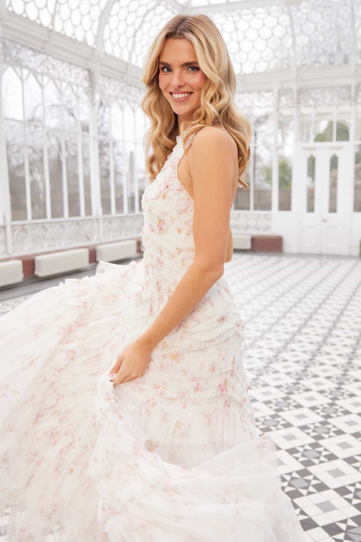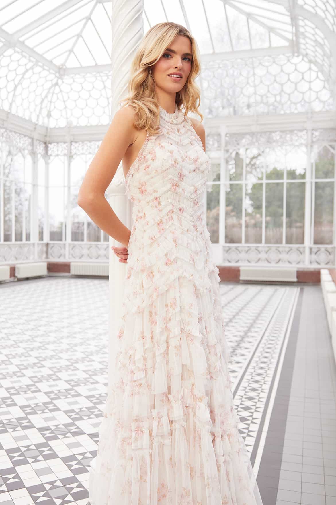 NEW SEASON. The Magnolia Ditsy Elia Halter-Neck Gown in Moonshine/Seashell. Adorned with whimsical floral motifs that scatter across soft tulle. Designed with a halter neckline and timeless ruffles, this gown perfectly balances modern simplicity with romantic detail.