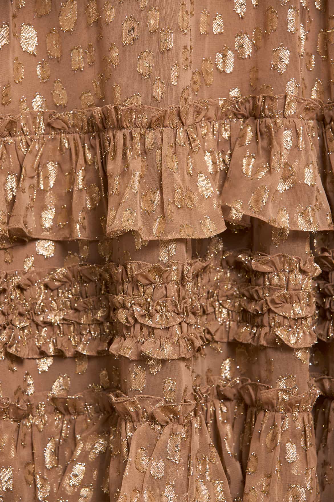 NEEDLE & THREAD EXCLUSIVE. The Odelle Lurex Round Neck Ankle Gown in Fawn is a Needle & Thread exclusive. Crafted from soft georgette with a gold metallic lurex motif, it offers a romantic, floaty silhouette. The gown is semi-sheer with a separate slip for modesty, the gown features layered frills at the hem for a signature, statement finish.