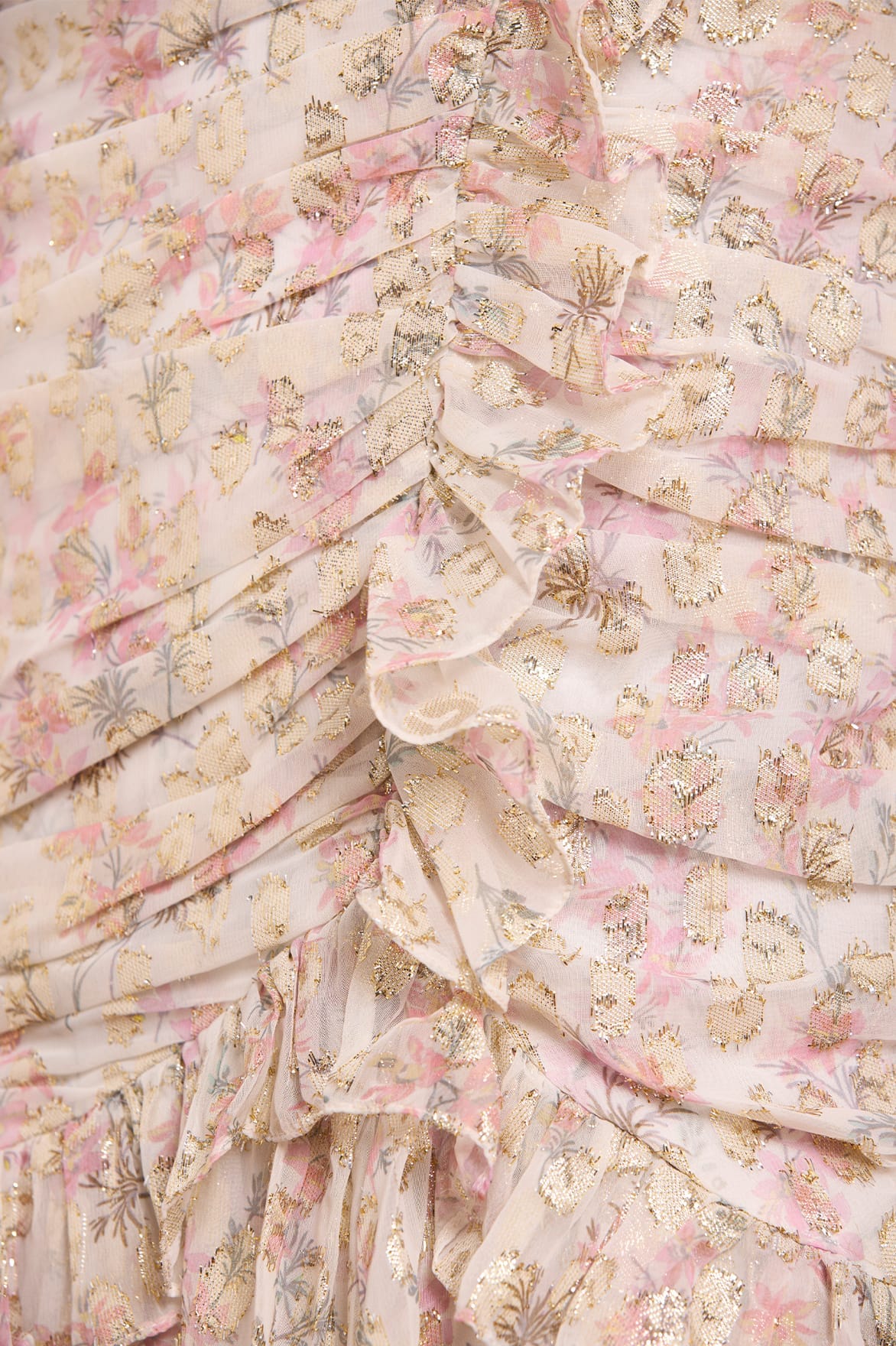 The Ophelia Ditsy Lurex One-Shoulder Micro Mini Dress in Moonshine/Pink. This romantic trailing print is taken from an archive, hand-painted artwork from the early 1900s, depicting soft, whimsical ditsy floating florals. This playful one-shoulder dress boasts a flattering gathered ruche detail engineered across the body and adorned with signature Needle & Thread frill detailing. Designed with a blouson sleeve featuring a ruffle cuff and romantic frills. The slim silhouette features a dropped waist seam with a flirty frill tier. The stretch lining fabric ensures fit and comfort. The perfect dress for an upcoming occasion.