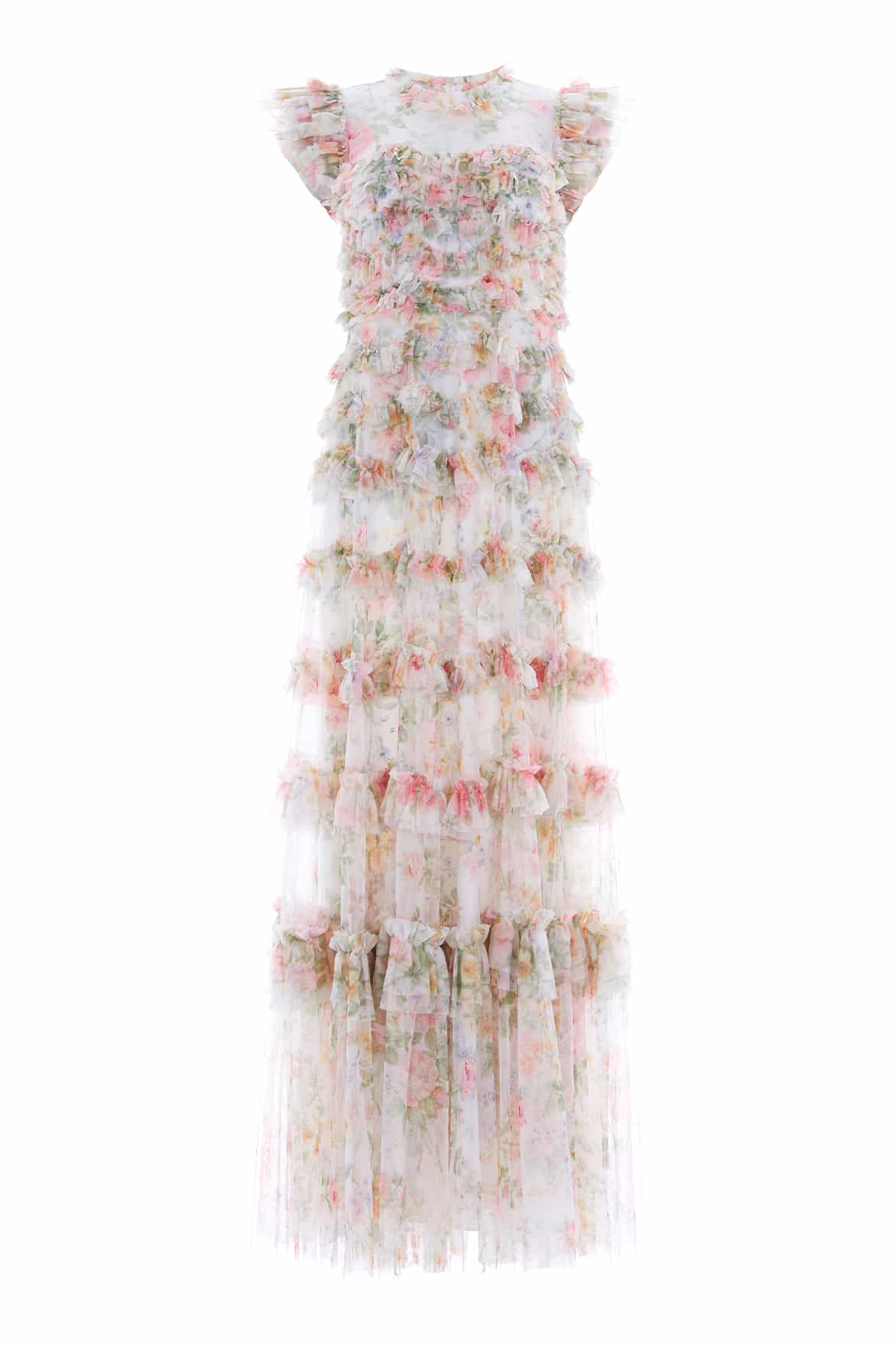 The Pompadour Garden Round Neck Gown in Moonshine. Inspired by the opulent wall coverings of the Palace of Versailles, this gown features luxurious hand-painted floral bouquets and trailing ditsy motifs, exuding timeless elegance. The frothy short sleeves, crafted from gathered tulle frills, add a romantic touch, while signature Needle & Thread frills adorn the neckline. Delicate scalloped borders and frills create a textured, ethereal effect throughout, making this gown a true embodiment of luxury and artistry.