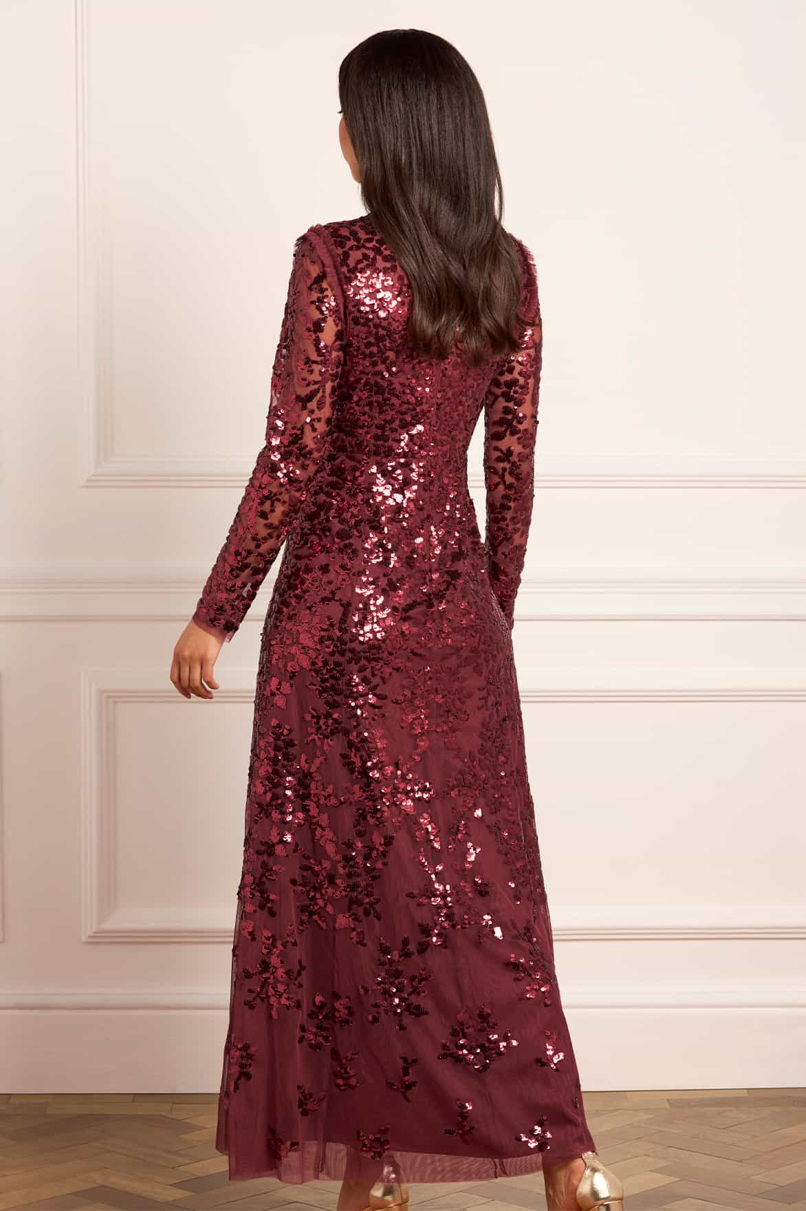 NEW SEASON. The Rosanna Lattice Round Neck Gown in Winterberry. Romantic and striking, this gown reimagines archival florals for a modern muse. The bodice is embroidered with dense sequin florals that transition into an ornate lattice before softening into scattered sequins toward the hem. Crafted in layers of lightweight tulle, the gown flows with movement. The winterberry palette intensifies its richness, evoking the depth of night skies in the Bright Star story.