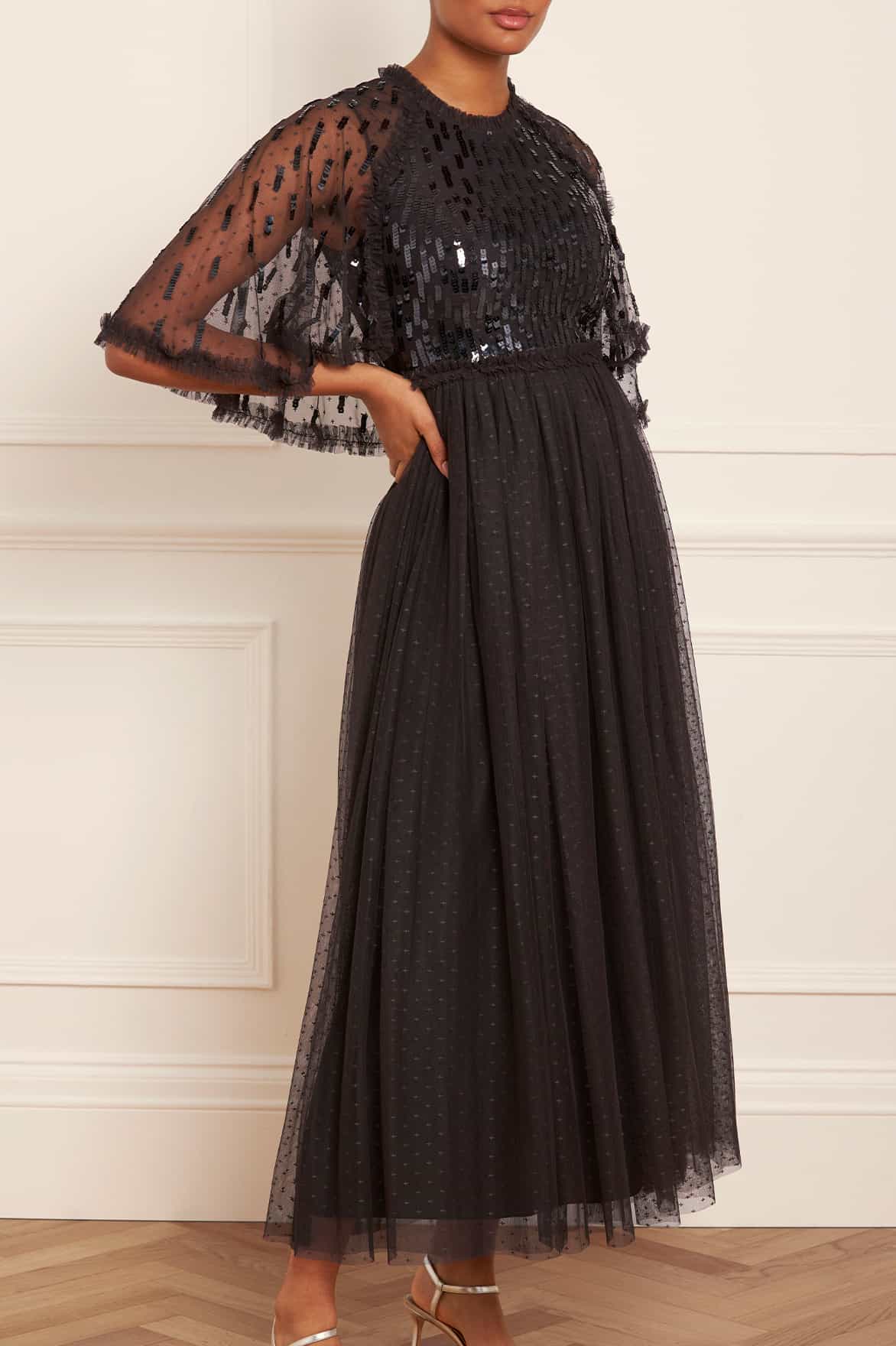 The Sequin Dash Bodice Ankle Gown in Graphite. The bodice of this ankle length gown is adorned with statement, square sequins in a staggered linear layout creating a shimmering effect. Developed with a loose silhouette for an effortless, floaty feel featuring voluminous sleeves for a romantic look. The skirt is crafted with layers of net tulle creating movement as you walk. The perfect gown for an upcoming special occasion.