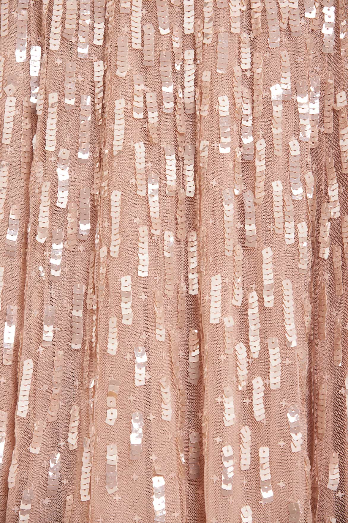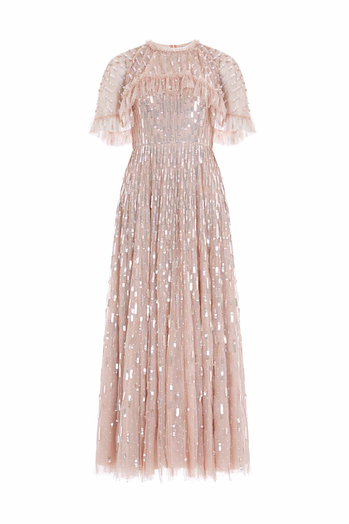 The Sequin Dash Cape Ankle Gown in Sand. This ankle length gown is adorned with statement, square sequins in a staggered linear layout creating a shimmer throughout. Developed with a loose silhouette for an effortless, floaty feel featuring voluminous sleeves for a romantic look. This gown features a layered cape design, which can be removed for versatile styling. The skirt is crafted with layers of net tulle creating movement as you walk. The perfect gown for an upcoming special occasion.