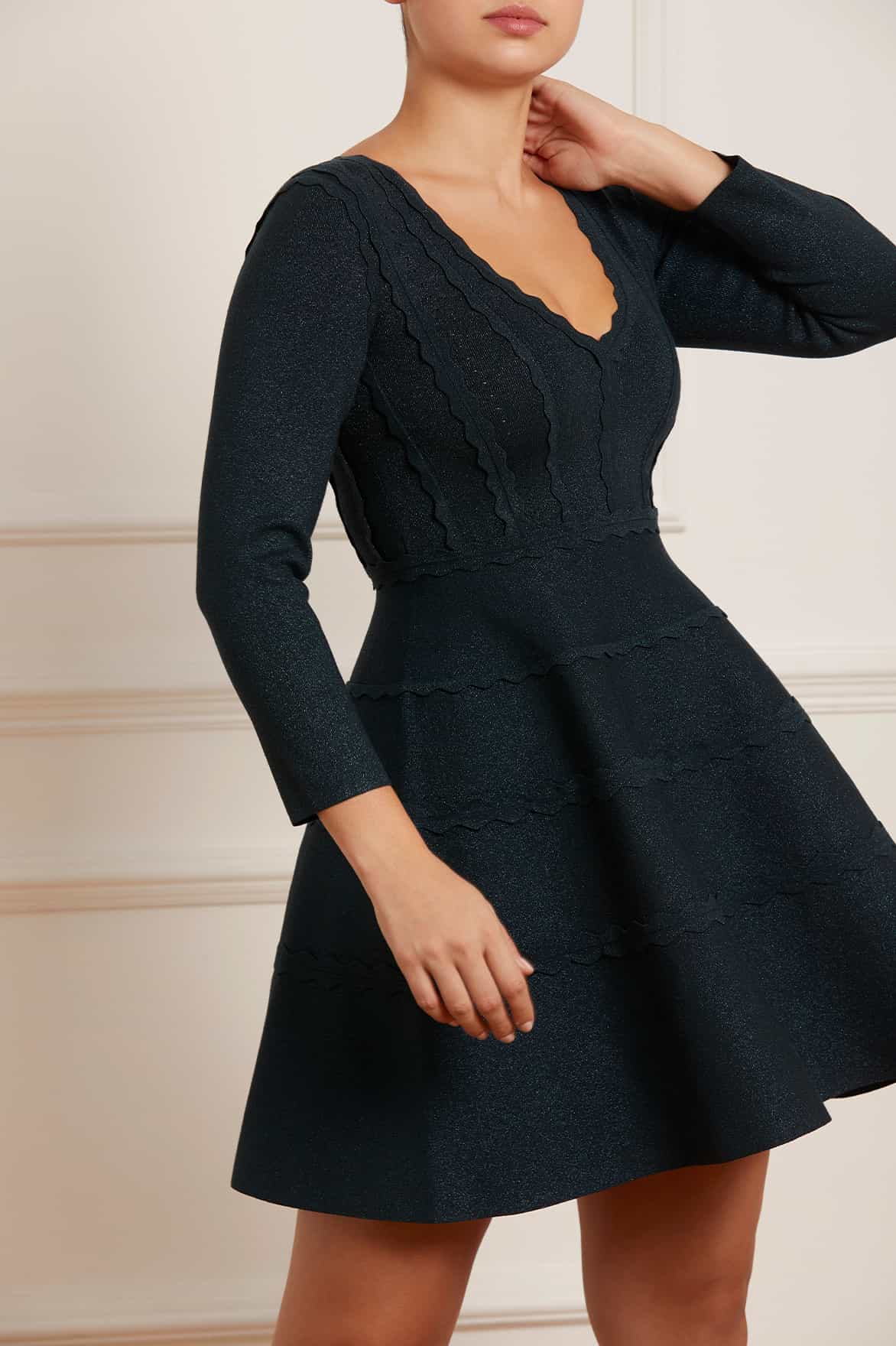 The Shimmer Knit Mini Dress in Emerald. This mini dress is designed with a shimmer knit fabric inspired by vintage textiles. Crafted intricately with knitted scallop trims for signature Needle & Thread detailing. Developed from a responsibly sourced stretch viscose, twisted with tonal lurex for a delicate subtle shimmer. Designed with a fitted bodice and V-neckline for a flattering silhouette. The perfect dress to take you from day to night.