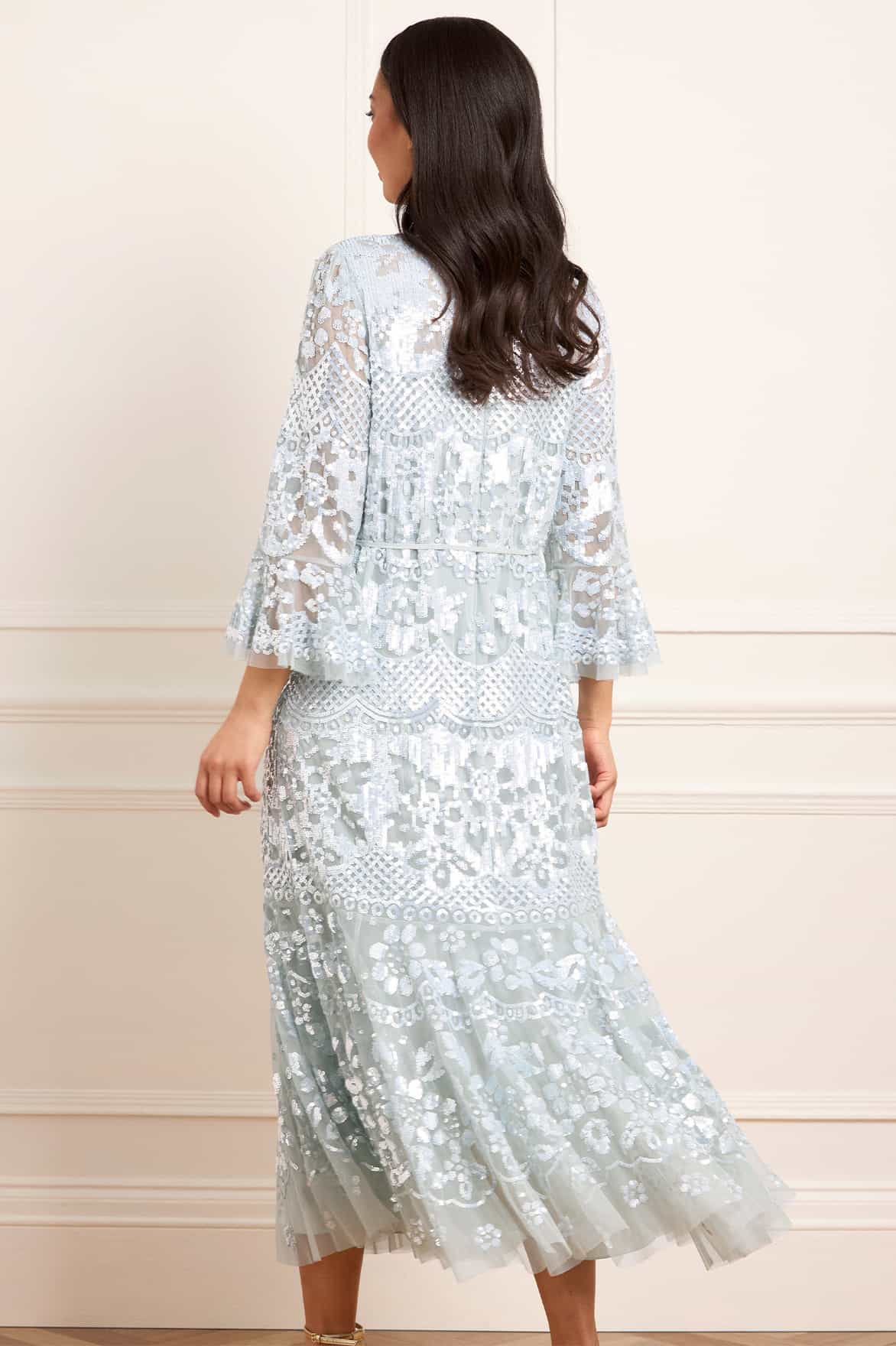 The Snowdrop Ankle Gown in French Blue. A heritage Needle & Thread design, this timeless gown features shimmering sequin artwork inspired by antique tablecloths from the early 1900s. Intricate floral borders and lattice patterns create a striking, heirloom-like embellishment. Designed for effortless elegance, the gown has a relaxed fit with a slim crepe waist tie for versatile styling. Crafted with romantic fluted sleeves, a softly tiered hem, and signature frill detailing at the neckline complete the look.