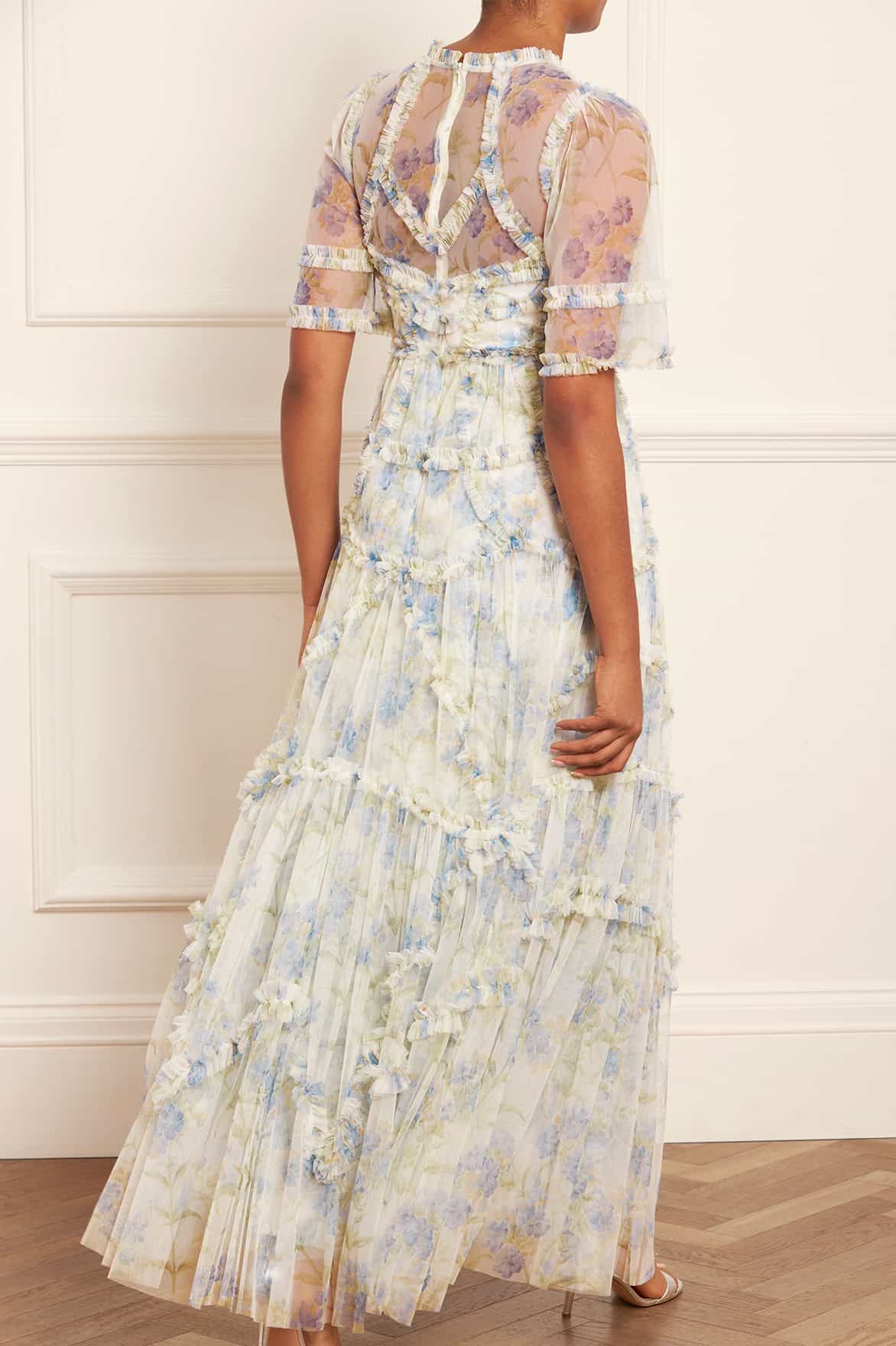 The Summer Posy Short Sleeve Gown in Moonshine. The print of this gown is taken from a 1930’s hand-painted wallpaper design. The artwork features a series of powder blue posies scattered in a soft formation. This signature Needle & Thread style is developed with delicate tulle, featuring intricate gathered ruffles engineered to create a flattering textile. Expect all eyes on you in this magical, fun piece.
