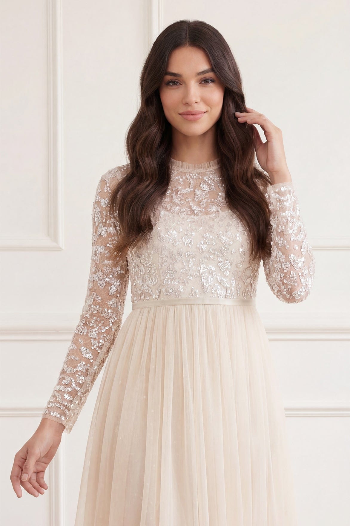 NEEDLE & THREAD EXCLUSIVE. The Tempest Bodice Ballerina Dress in Champagne / Pink. This beautiful ballerina dress is inspired by a vintage lace tablecloth design, embellished with shimmering pink sequins all over the bodice. Designed with long sleeves, a kisses tulle multi-layered skirt, and frill trim detailing around the neck. Make an entrance in the Tempest.
