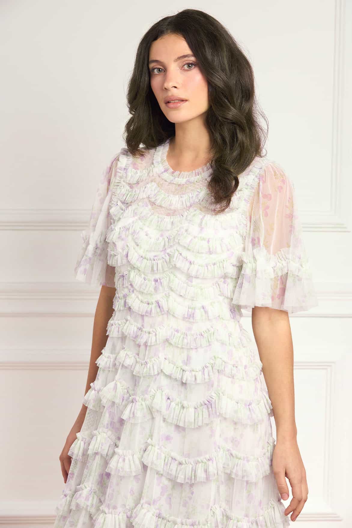 - Floral printed tulle decorated with layers of tulle ruffles.