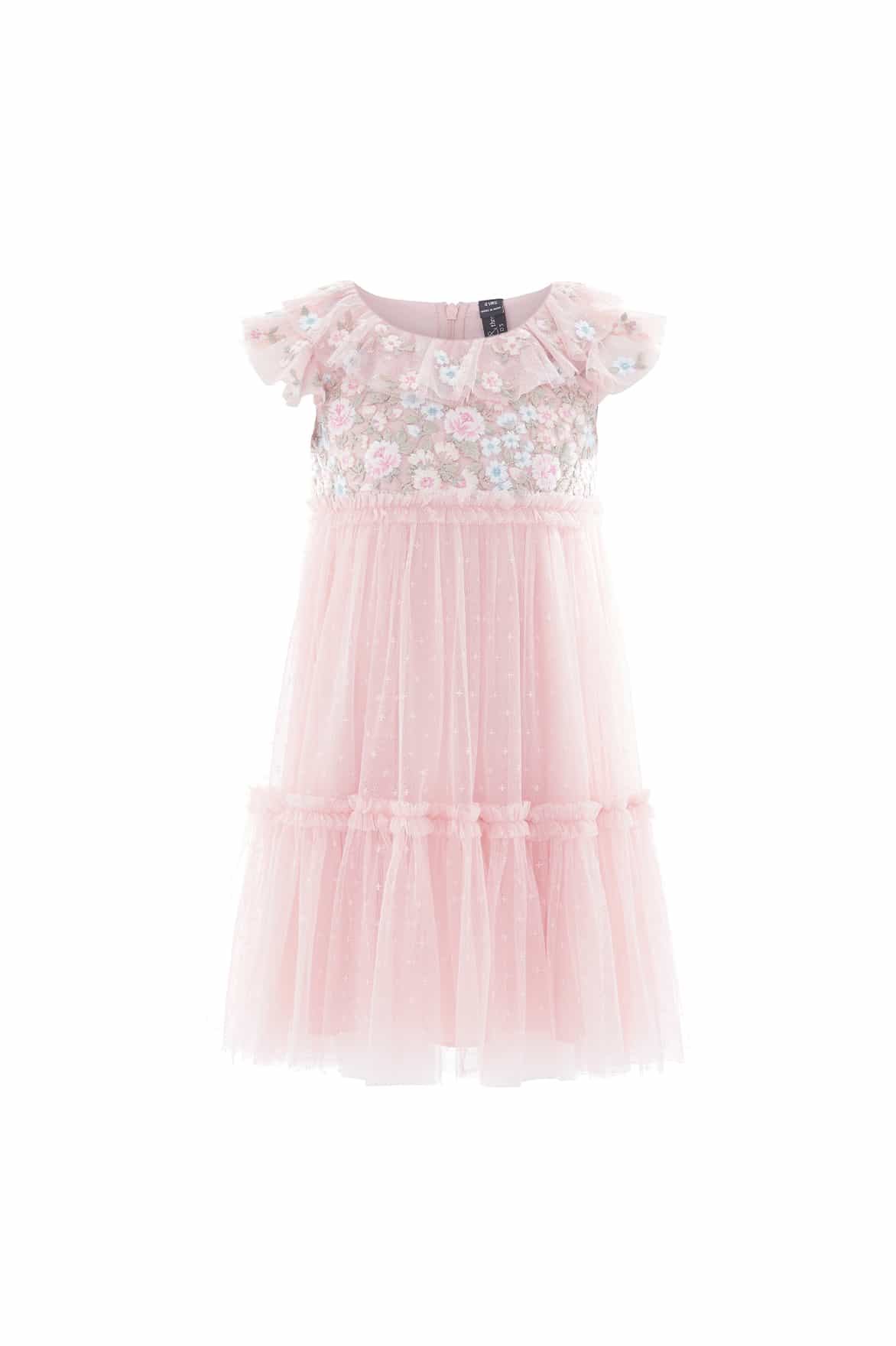The Antoinettes Floral Bodice KIDS Dress in Dusk Pink. This enchanting dress features a beautifully embroidered bodice with multicoloured floral bouquets, inspired by the lavish interiors of Versailles. Tulle frill neckline and sleeves are dotted with ditsy floral motifs, while the softly gathered skirt tier adds volume for a twirl-worthy finish. The perfect dress for a special occasion, a charming flower girl moment, or simply for dressing up.