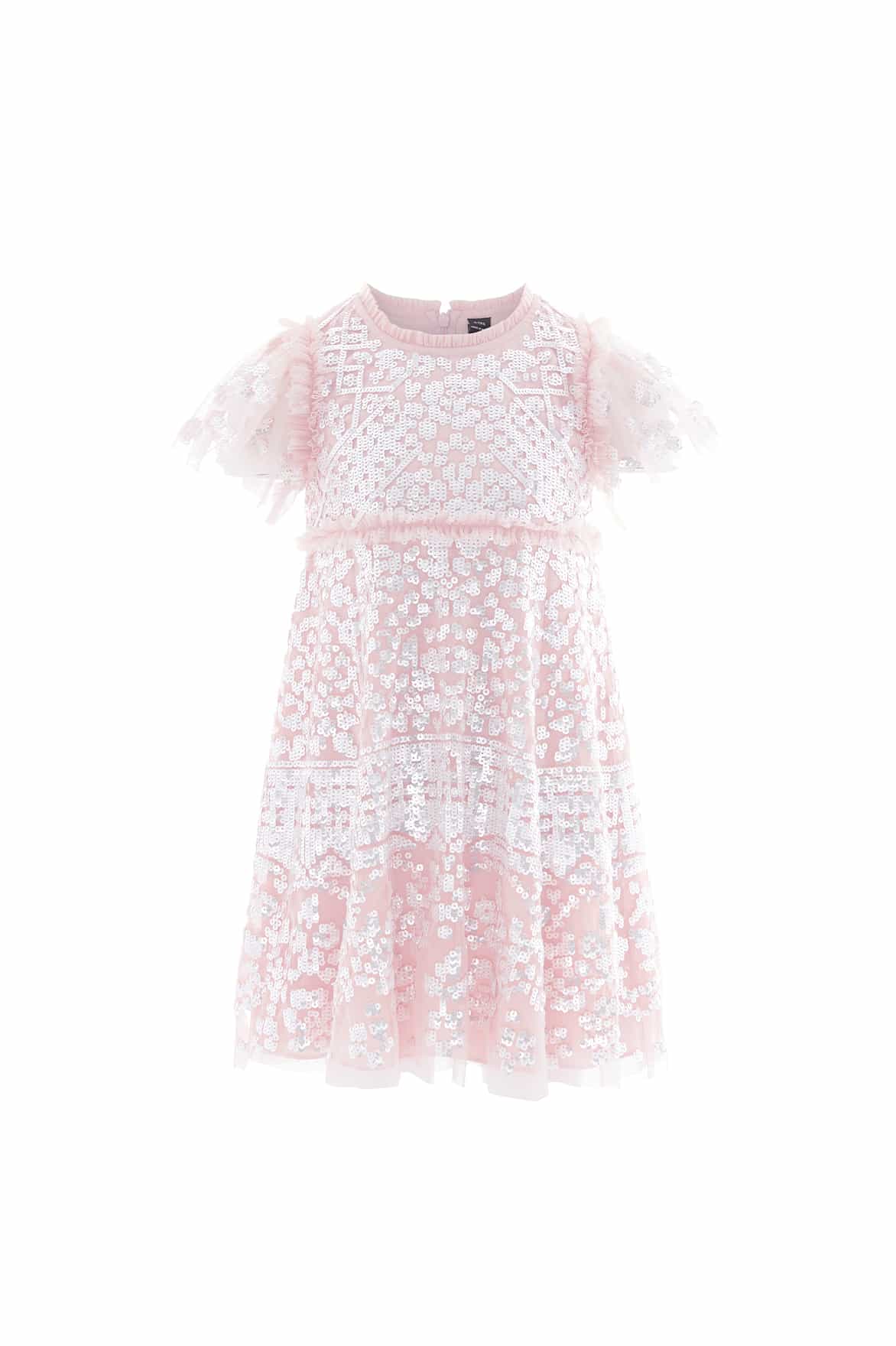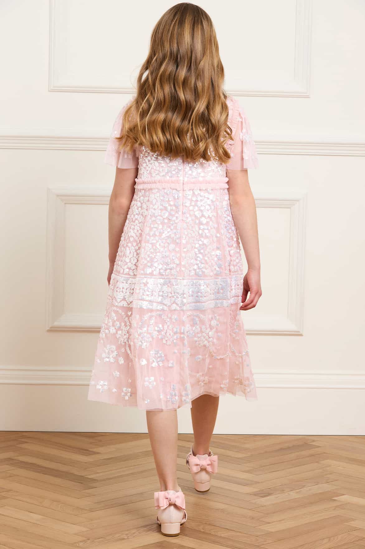 The Aurora KIDS Dress in Dusk Pink/Cream. A heritage style from the Needle & Thread archive, inspired by early 1900s antique tablecloths. Crafted with intricate sequin embroidery and signature tulle frills at the neckline, waist, and sleeves. Finished with a soft, layered tulle skirt for elegant movement. A dreamy fairytale dress that will make them feel like a true princess.