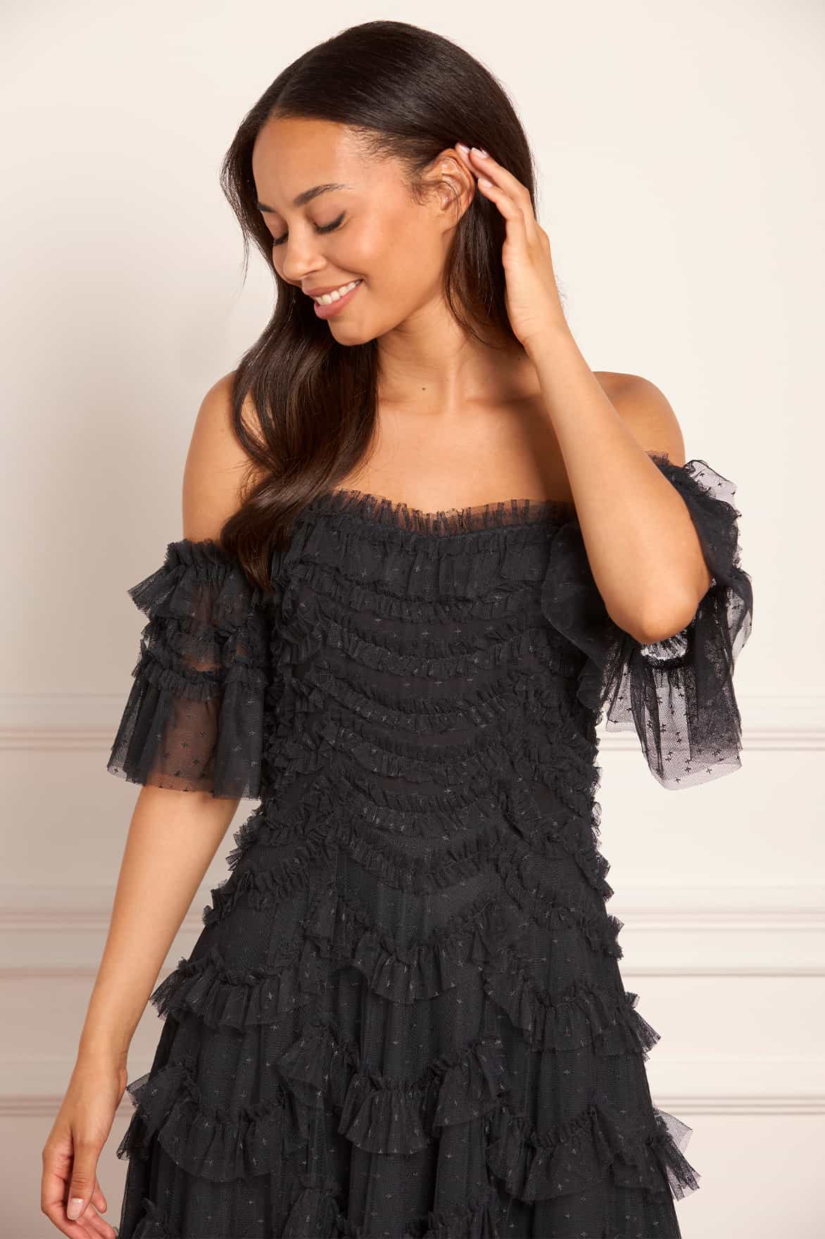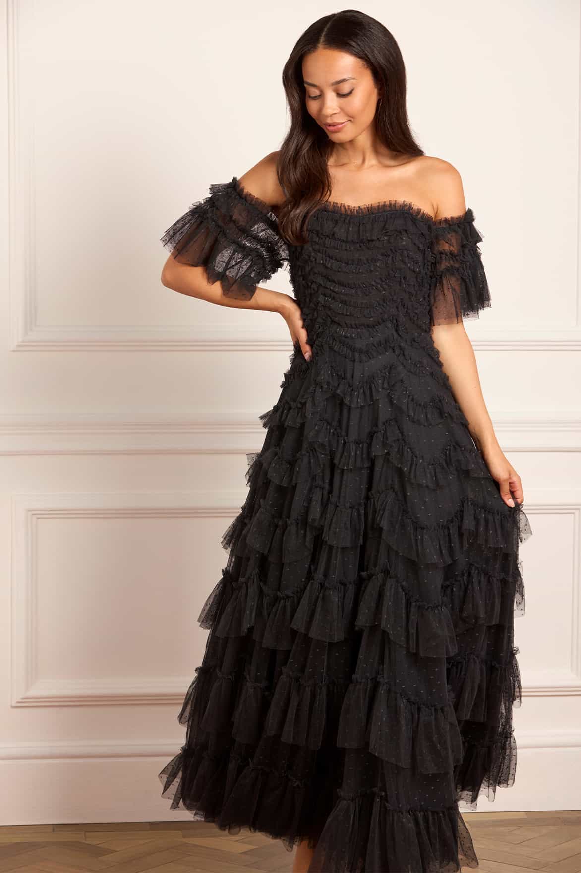 NEW SEASON. The Aviana Off-Shoulder Gown in Graphite. Modern and moody, this gown is an elevated eveningwear piece designed to mesmerise. Graduated tulle scallops cascade across the silhouette, balancing volume with lightness and the graphite tone offers a cool, contemporary twist on femininity.