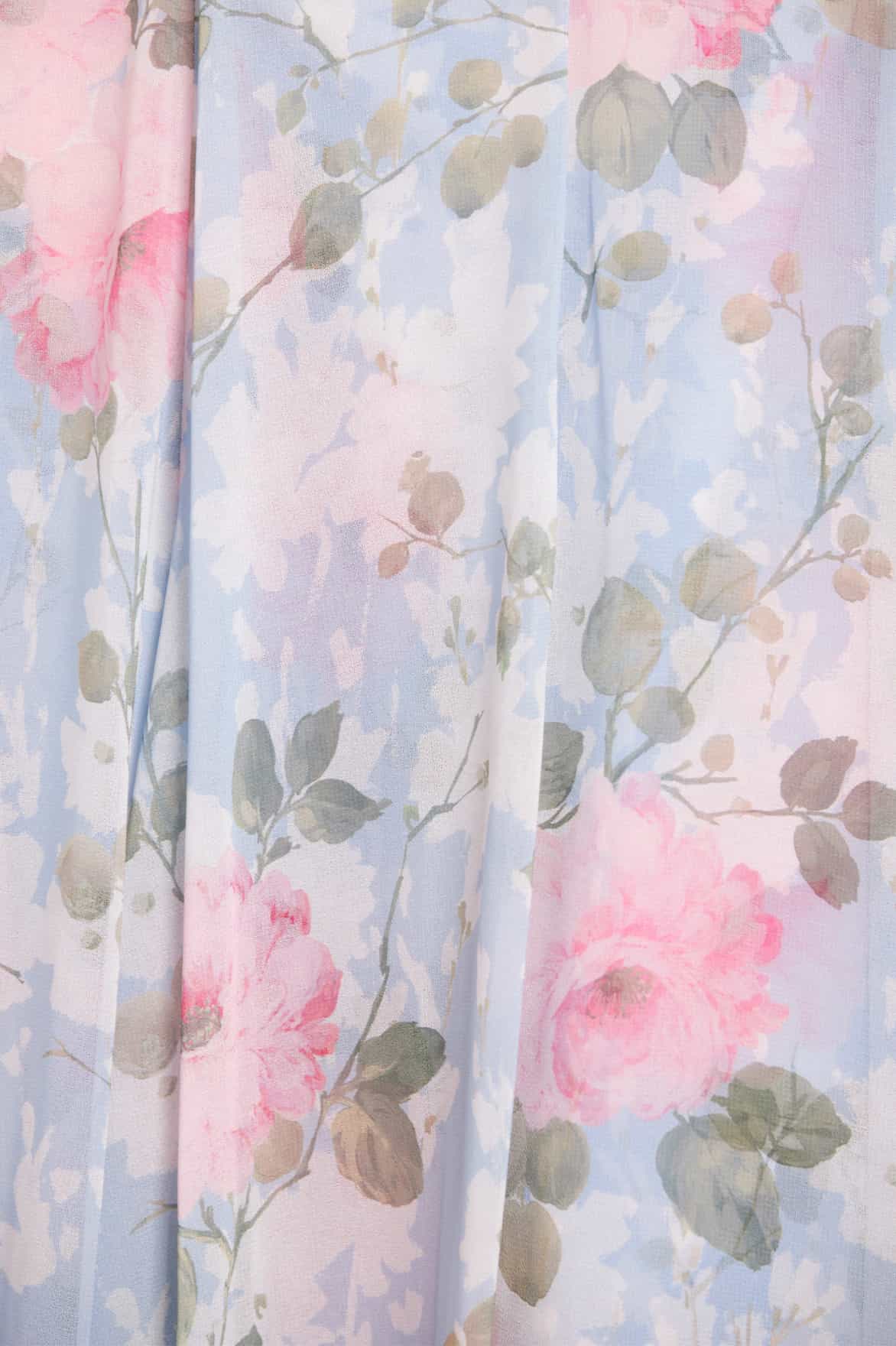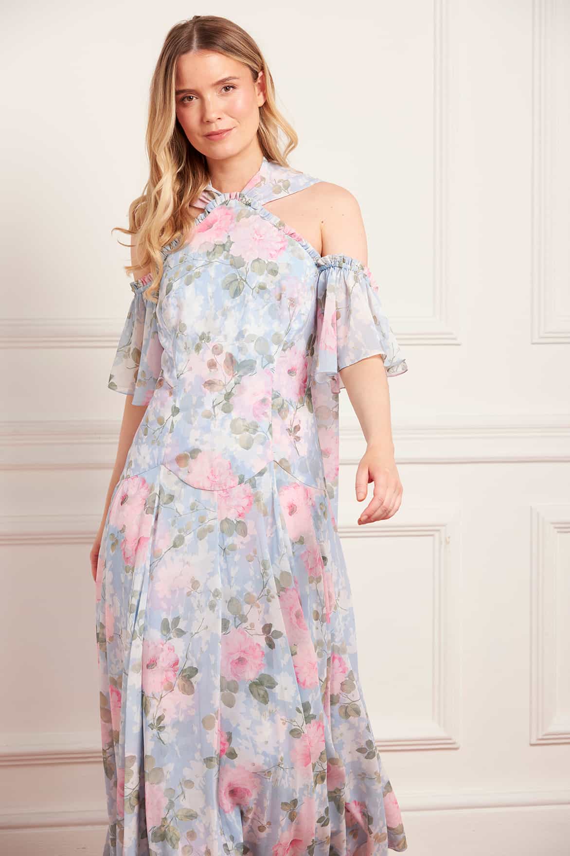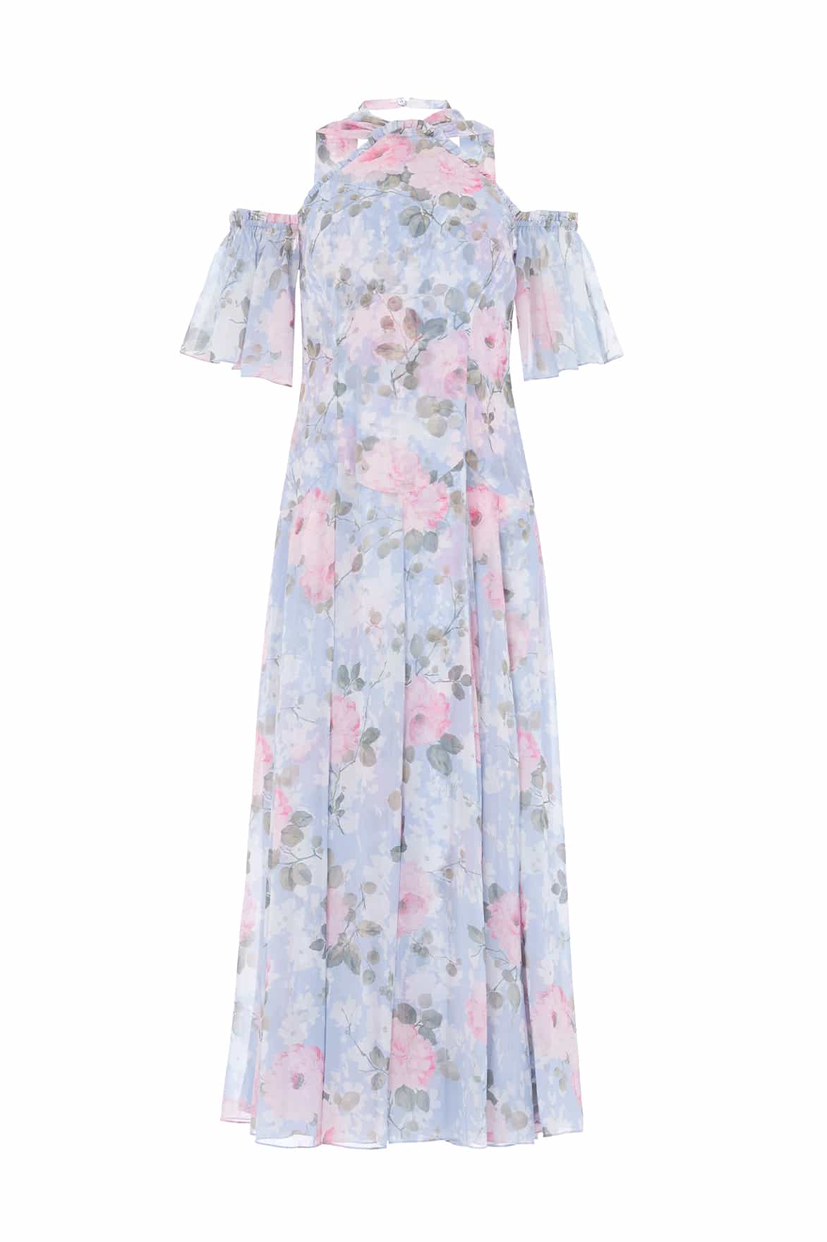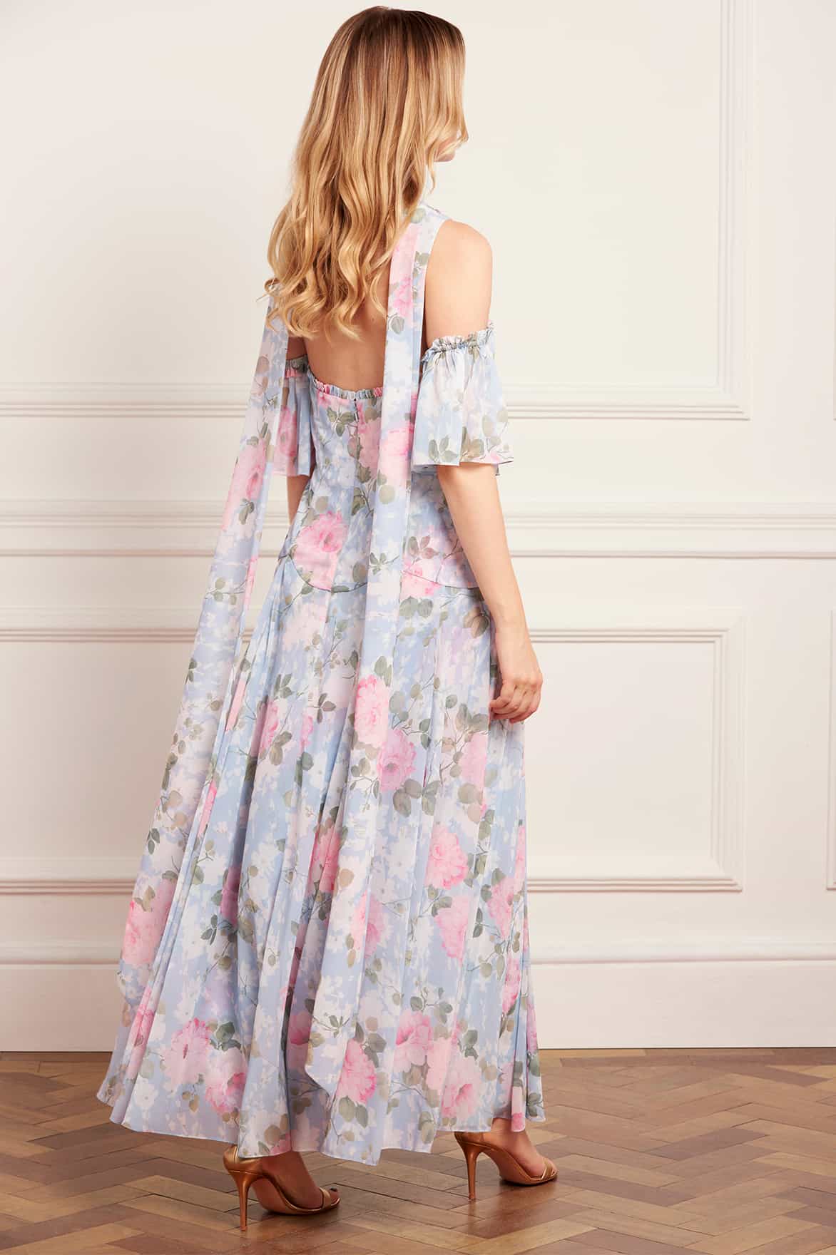 NEW SEASON. The Camille’s Garden Georgette Halter-Neck Gown in Skylight. Showcases the collection’s signature hand-painted floral print. Crafted from airy georgette and finished with a graceful sash tie, this gown is effortlessly elegant and feminine.