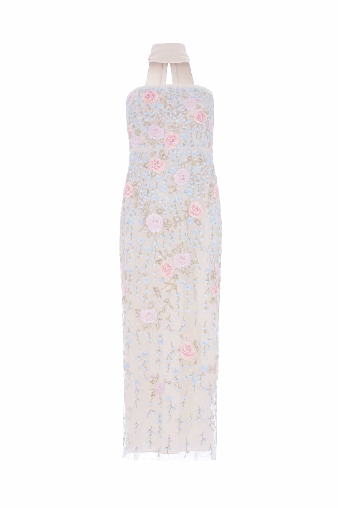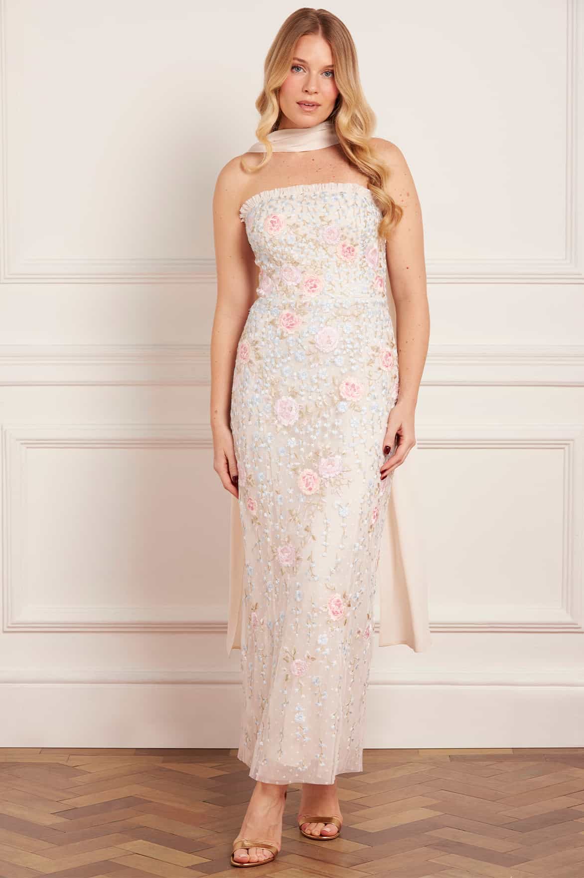 NEW SEASON. The Cressida Strapless Ankle Gown in Cream/Multi. Richly embroidered with peony blooms and delicate trailing florals. Cut to a soft A-line silhouette with a flowing tulle skirt, this romantic gown includes a coordinating sash scarf for added drama.