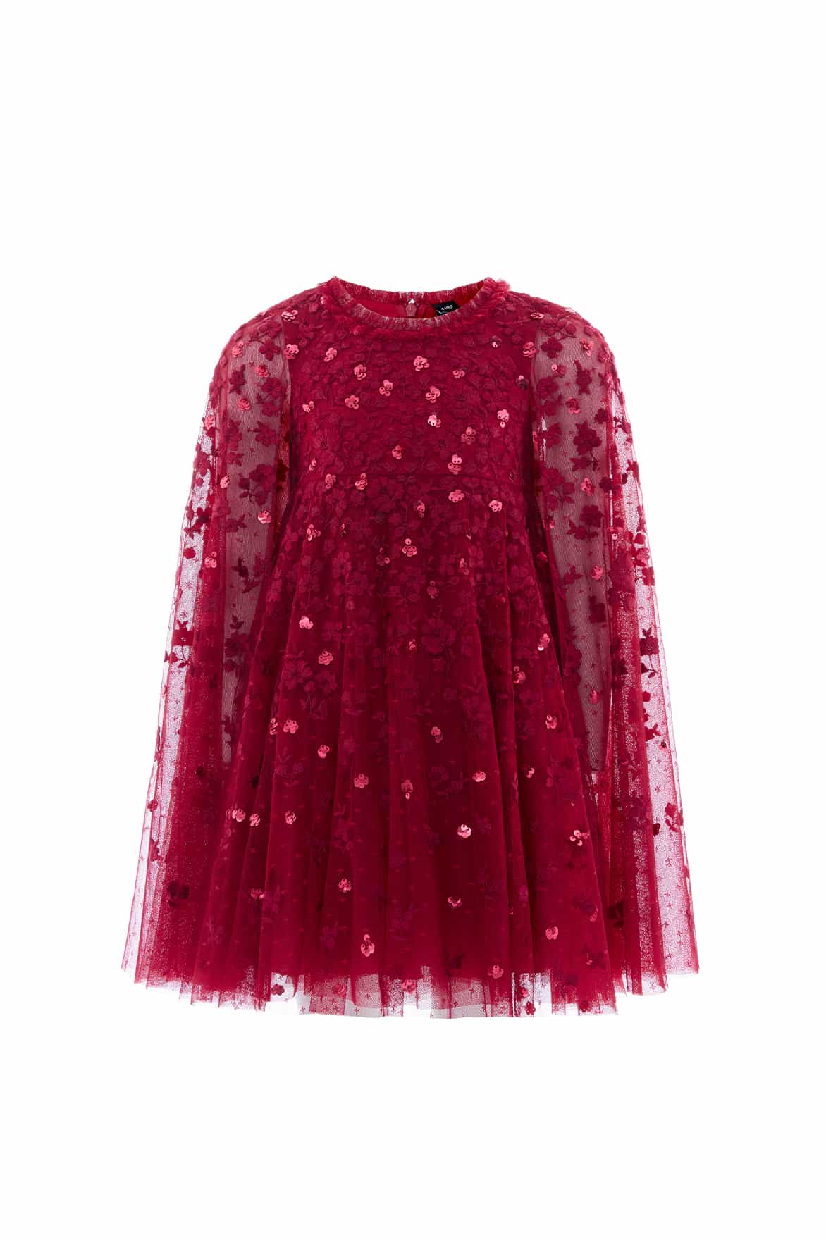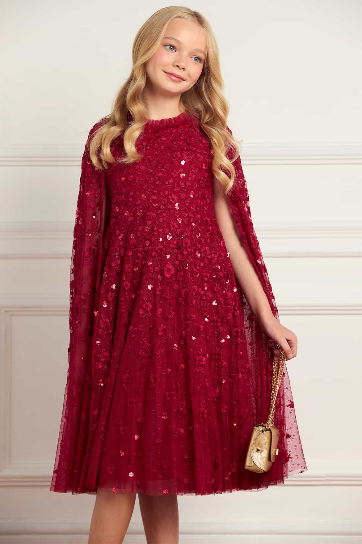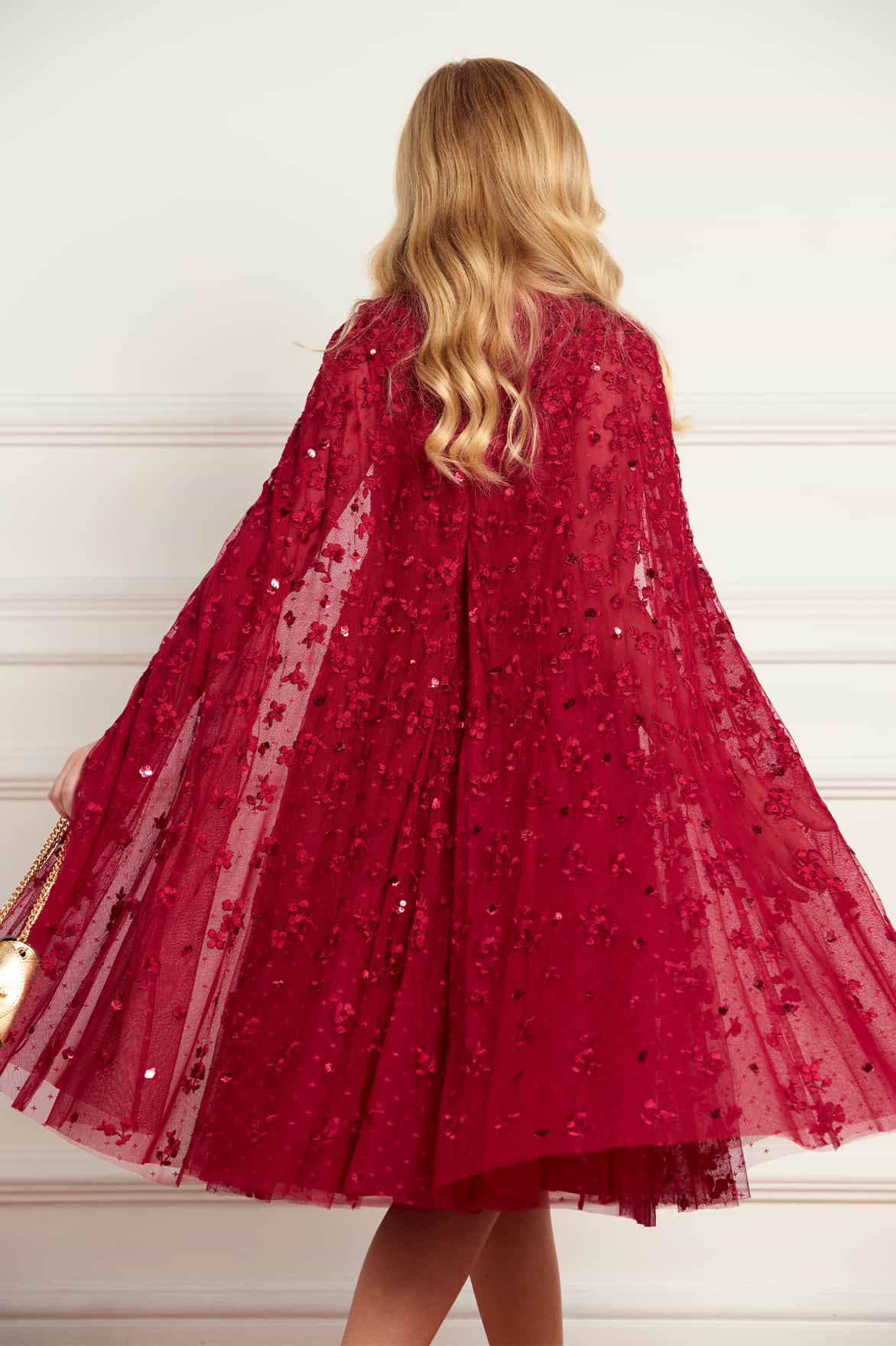 NEW SEASON. The Dahlia Ditsy Cape Kids Dress in Red. A whimsical piece inspired by Victorian florals in the Bright Star story. Designed with embroidered ditsy blooms scattered across tulle, the cape sleeves create an ethereal, fairy-tale effect. The vivid red colour adds festive vibrancy, while the flowing skirt ensures freedom of movement for dancing and play. Pair with the Dahlia Ditsy Cape Gown in Red from the womenswear collection for a mother-and-daughter match.