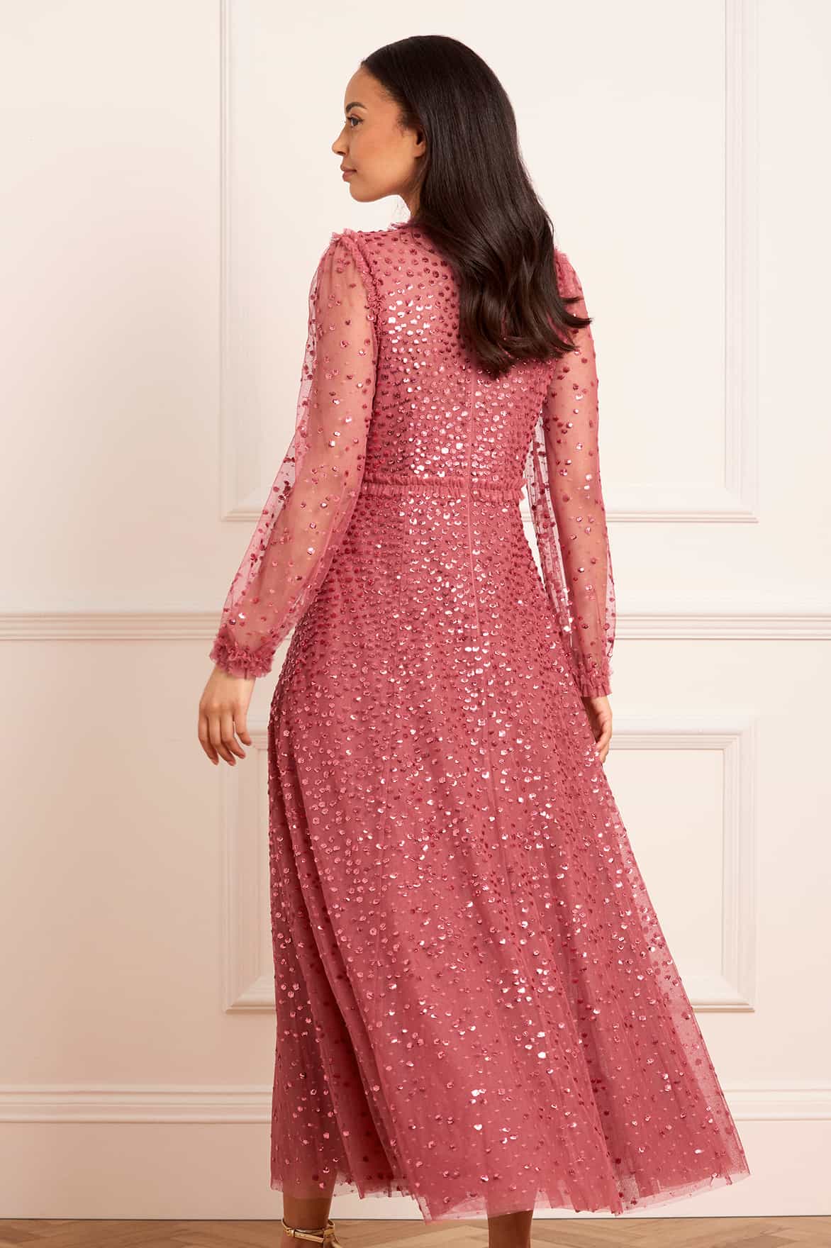 The Dappled Sequin Long Sleeve Ankle Gown in Dark Rose. This beautiful dress features a cascade of clustered sequin dots, scattered across the soft tulle base. With long fitted sleeves, a classic round neckline and gently flared skirt, this piece blends romance and radiance for a sophisticated finish.