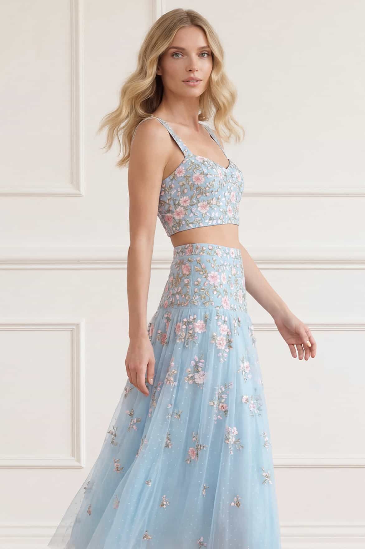 NEW SEASON. The Eden Rose Ankle Skirt in Aqua/Multi. This elegant ankle skirt features cascading Eden Rose embroidery that disperses into delicate ditsy florals towards the hem. Designed with a fluid silhouette for effortless movement, it is the perfect pairing with our coordinating Eden Rose top for summer occasion wear.
