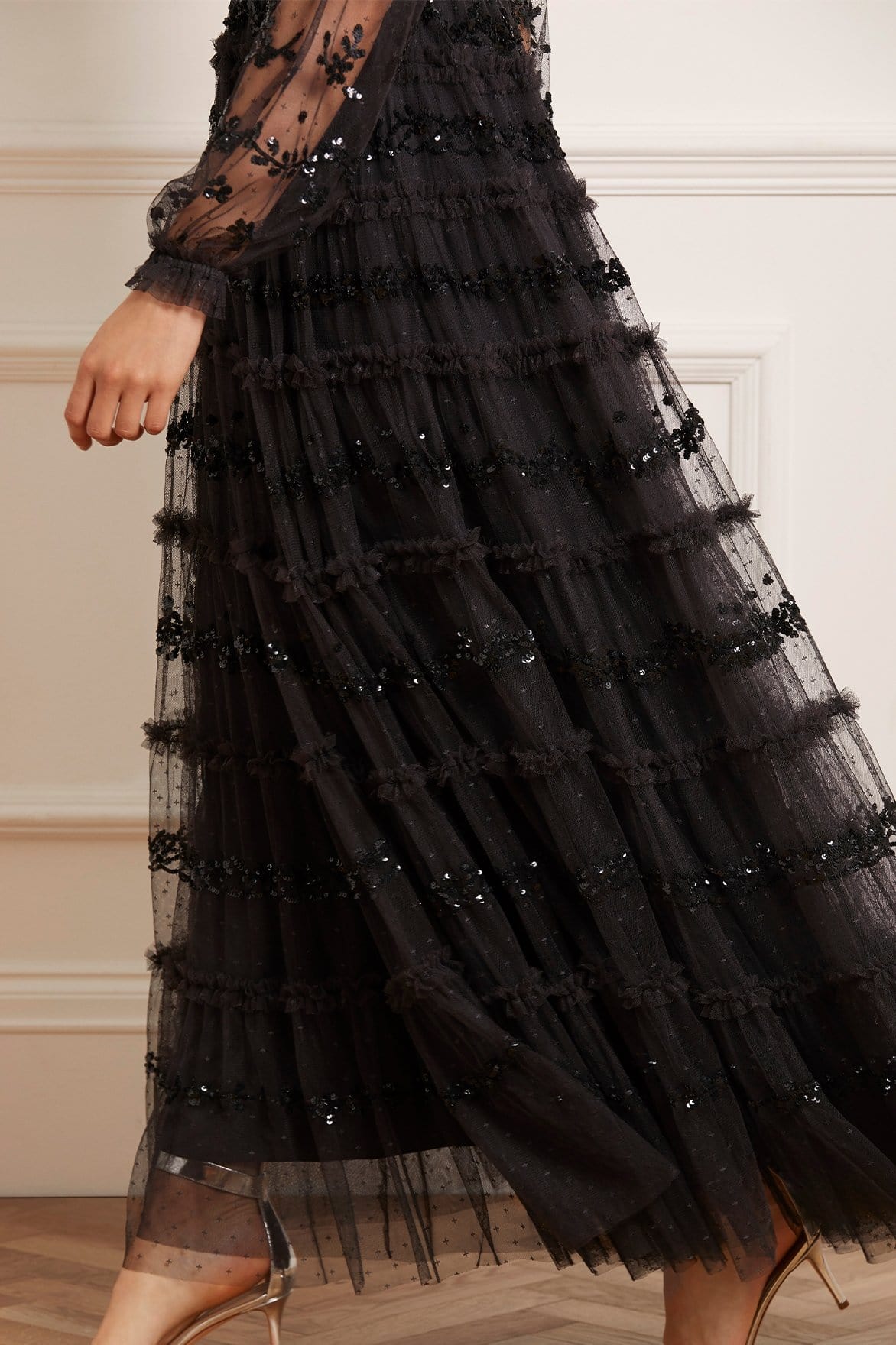 The Eve Sequin Gown in Graphite. This gown is romantically designed with a flattering, gently gathered bodice and full sleeves. Crafted with layers of our signature kisses tulle, and intricately adorned with shimmering sequin borders in pretty, lace-inspired designs. Make a statement in the Eve this season.