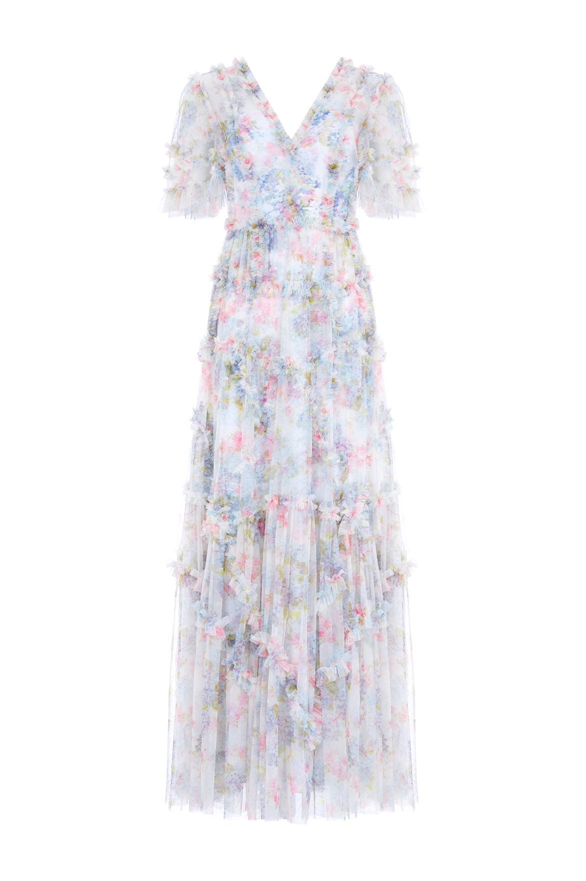 The Hydrangea Ruffle Gown in Moonshine. An exquisite statement print taken from the archive, this hand-painted artwork from the early 1900s depicts blooms of hydrangea flowers and smaller trailing florals, all rendered with a soft watercolour feel. This gown is crafted with signature Needle & Thread styling featuring tulle ruffles and layers of delicate tulle, creating pretty, effortless movement. A wardrobe treasure you'll forever hold onto.