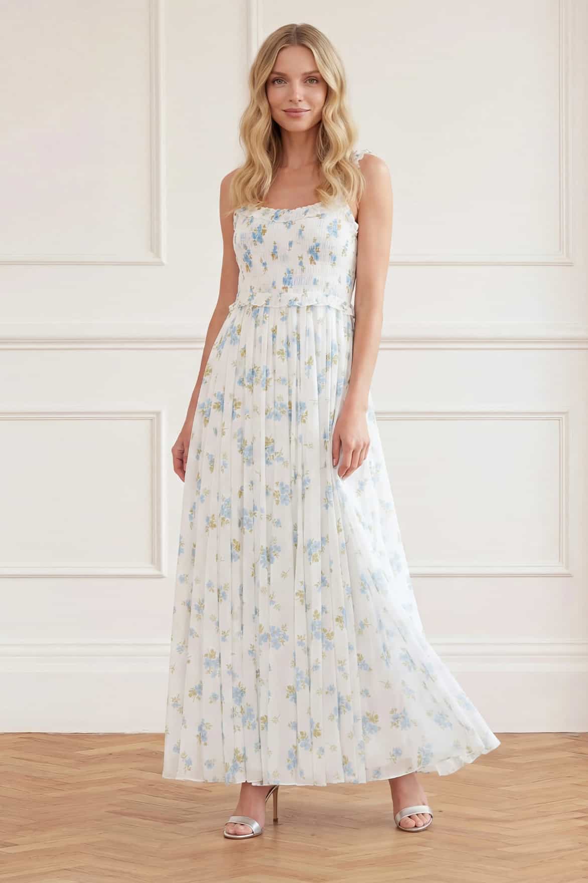 NEW SEASON. The Magnolia Ditsy Chiffon Smocked Cami Ankle Gown in White/Aqua. Adorned with a romantic Magnolia Ditsy print derived from early 1900s wallpaper designs, this chiffon cami gown captures the softness of trailing magnolia blooms. The smocked bodice offers gentle structure, while the flowing ankle-length skirt enhances movement.